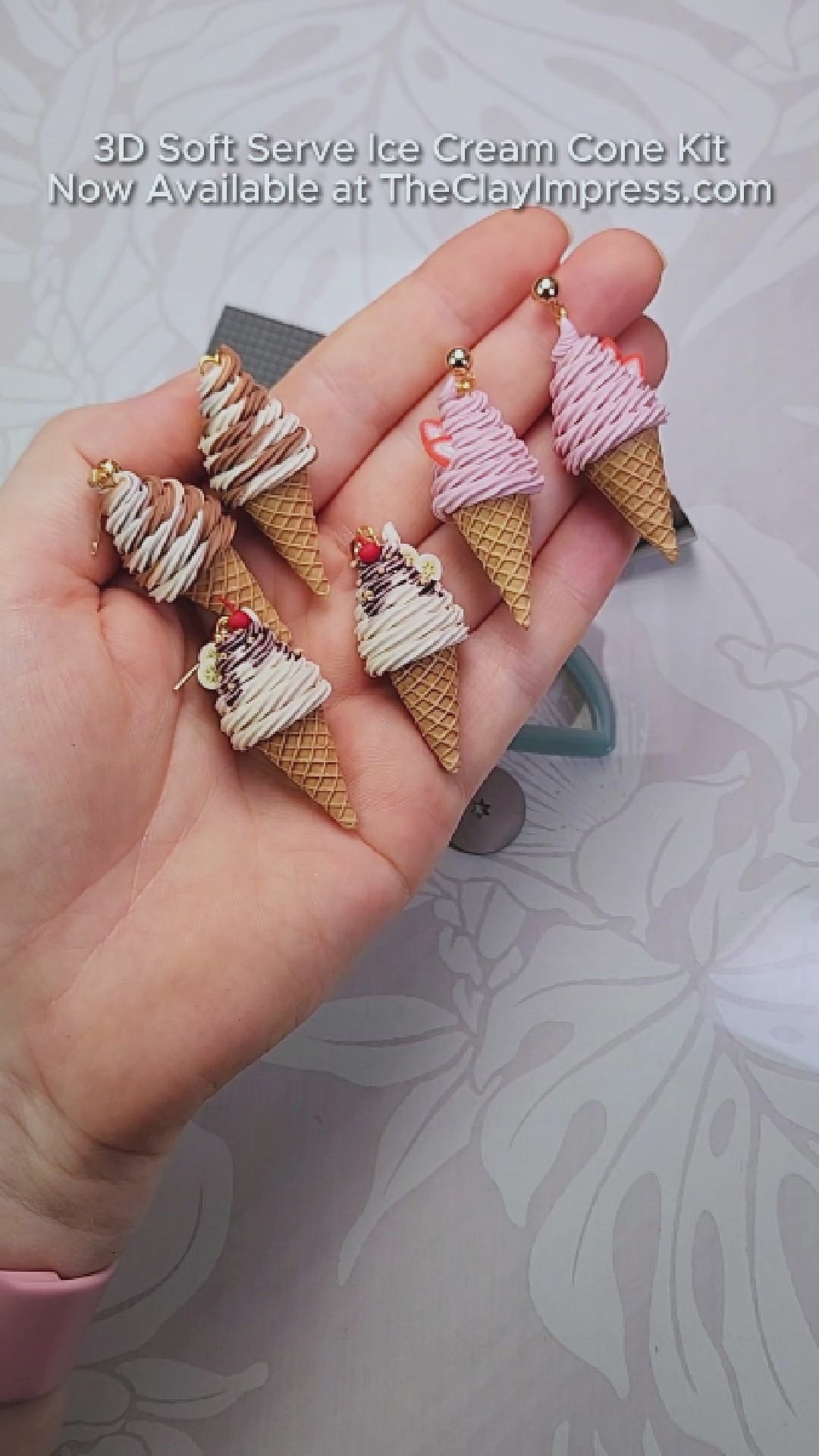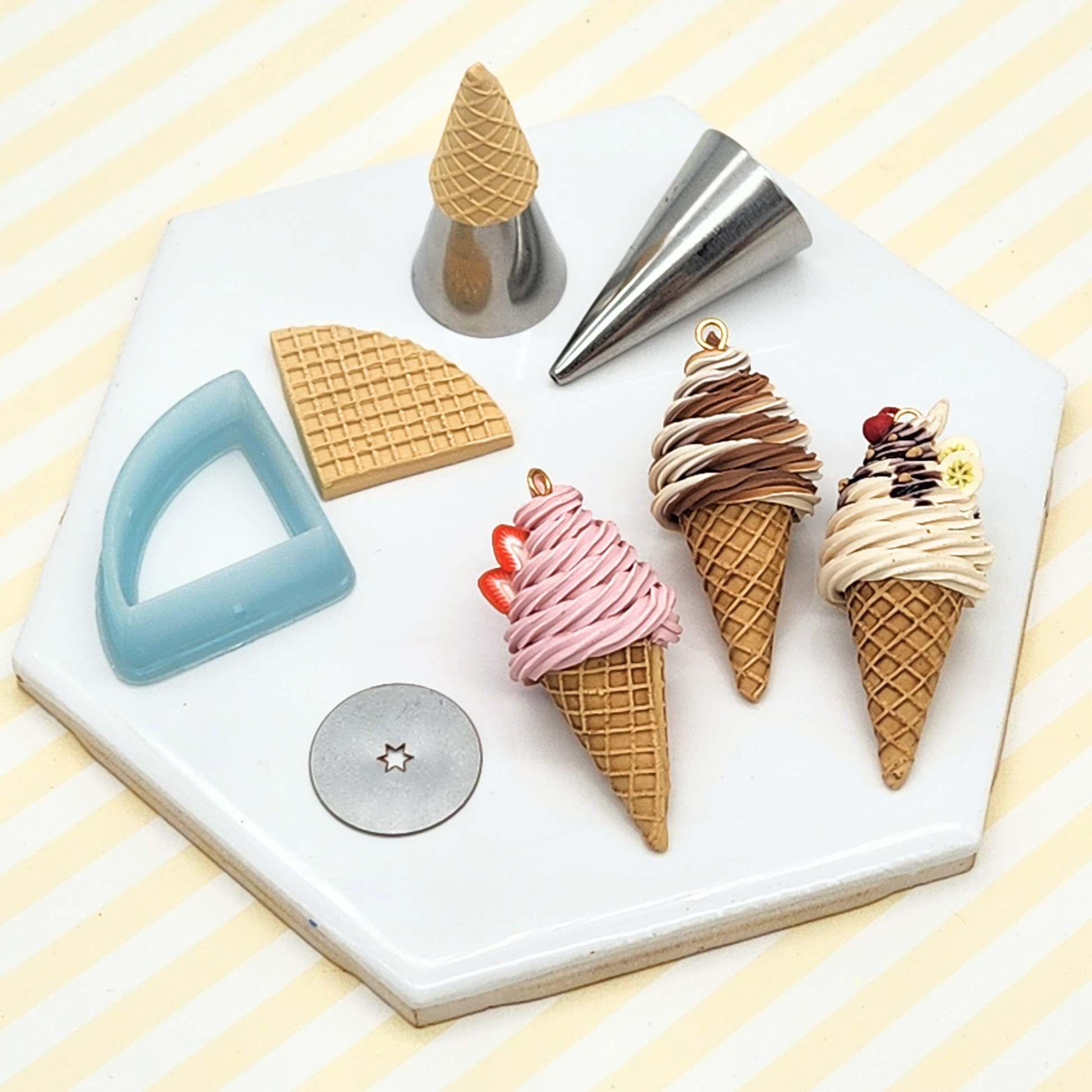 Create adorable 3D polymer clay soft-serve ice cream cones with our comprehensive kit! Each assembled ice cream cone stands approximately 4 cm tall, perfect for earrings! The full kit includes: