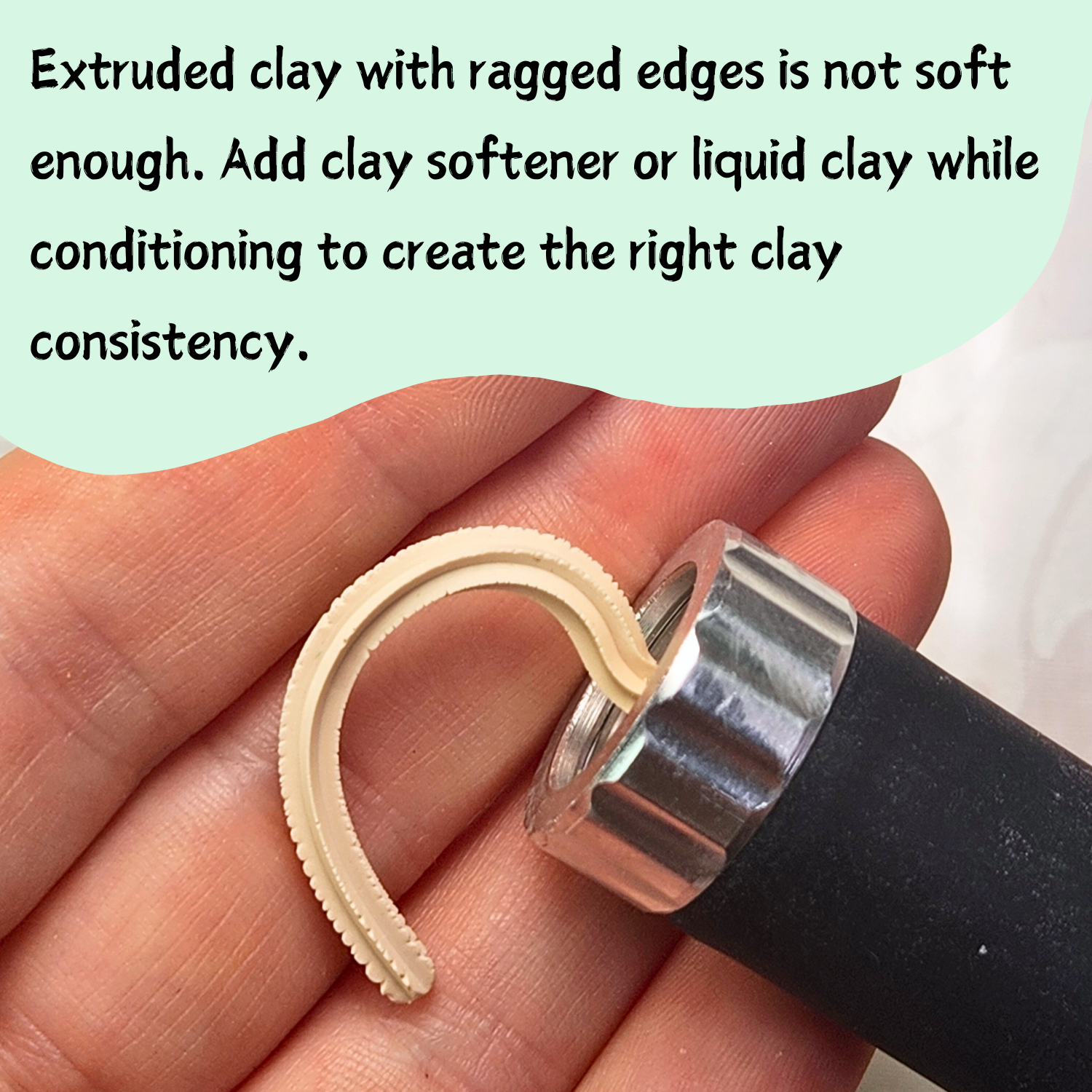 - Use the star-shaped extruder disc and extrude some clay into a long snake. Make sure the clay is very soft and well-conditioned. If the clay that comes out of the extruder is ragged, the clay is not soft enough. Add some clay softener or liquid clay and continue conditioning the clay until it's soft enough to extrude smoothly.