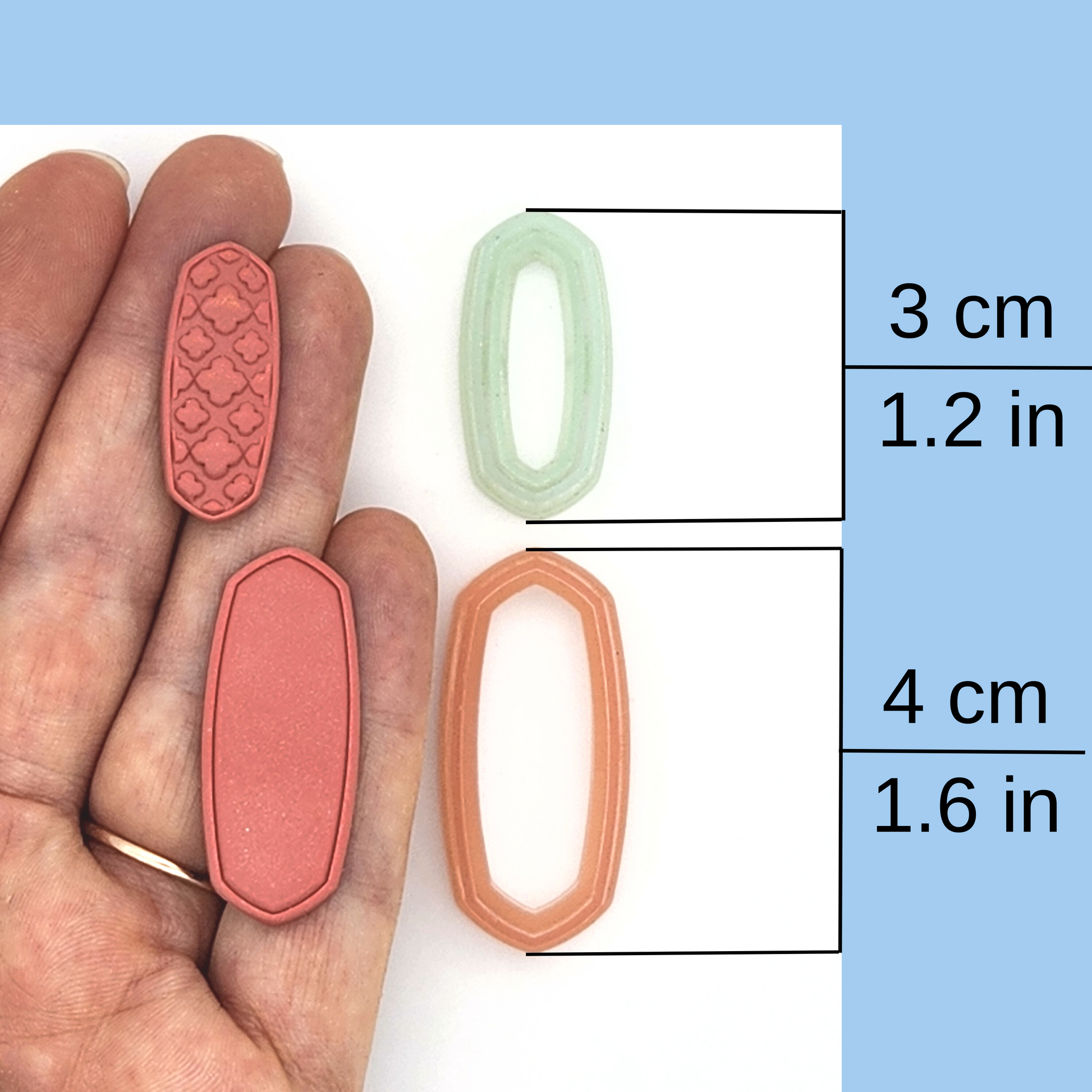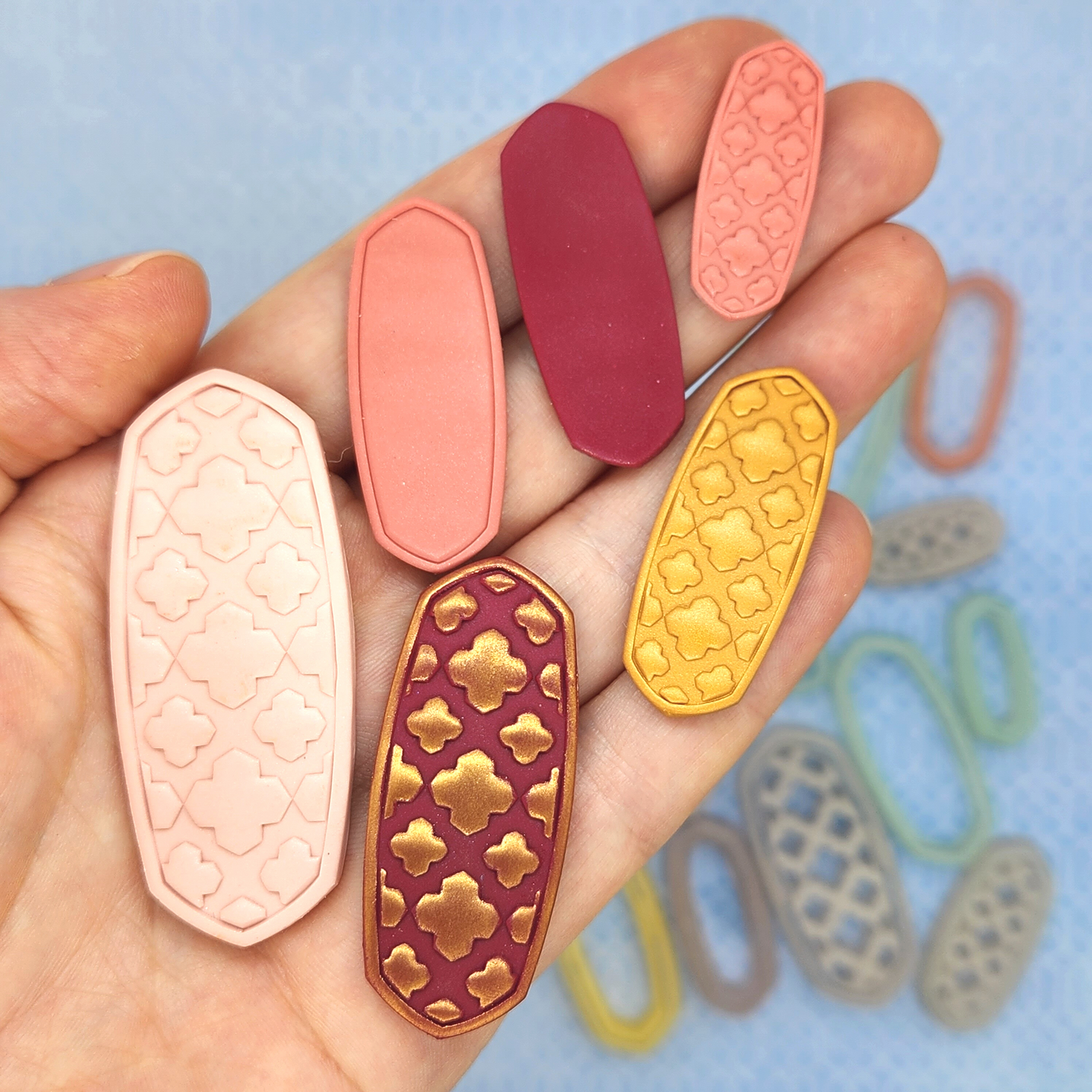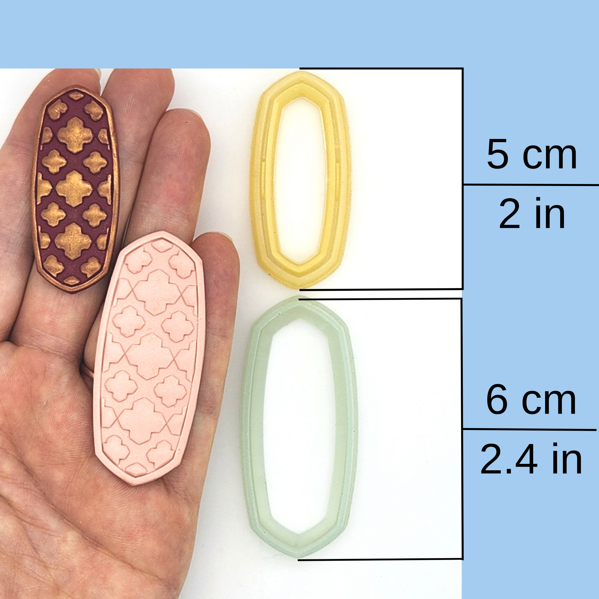 This Moroccan polymer clay cutter is available in three styles: Outline, Simple Frame Debossing, and Detailed Debossing cutters. It's also available in four sizes, 3 cm to 6 cm.