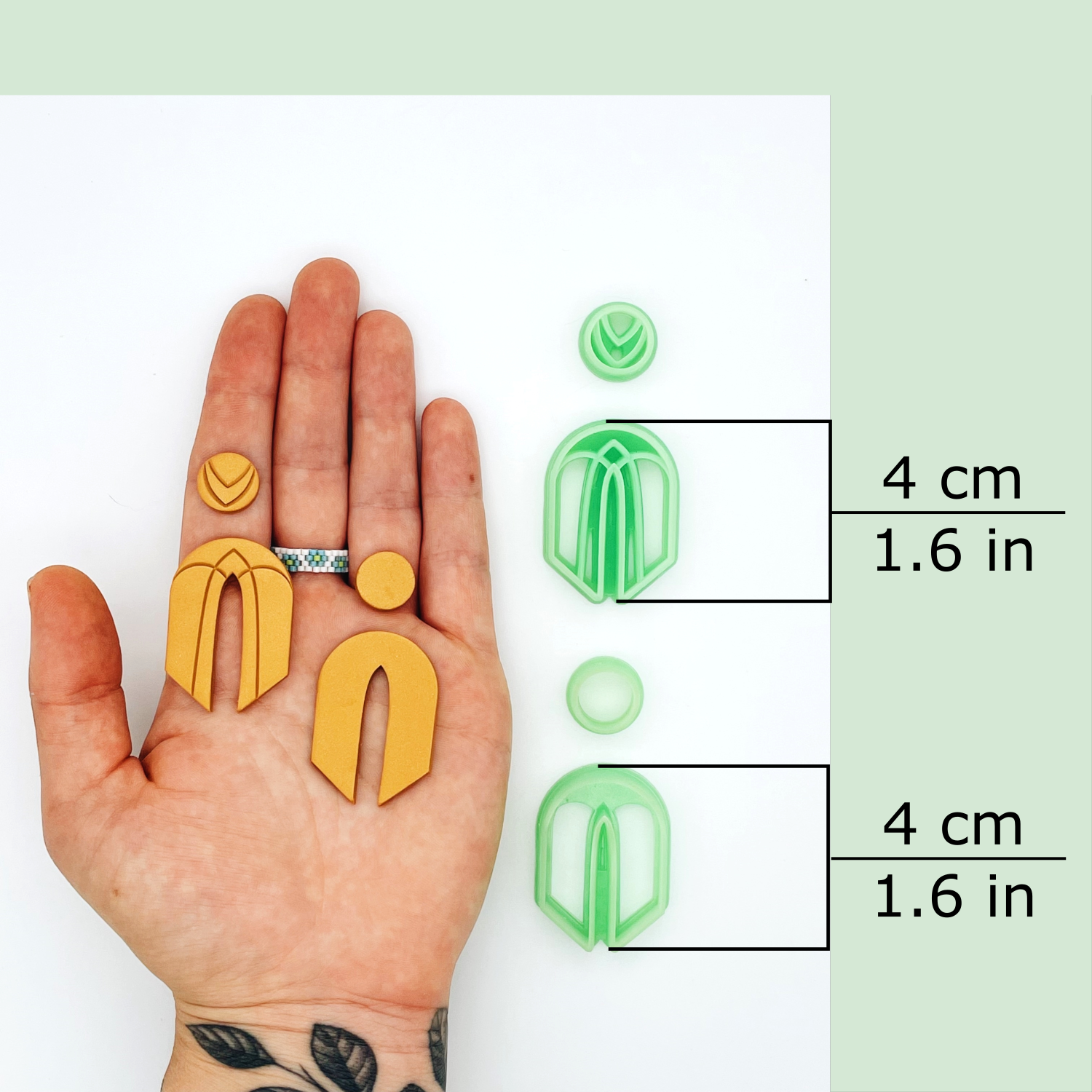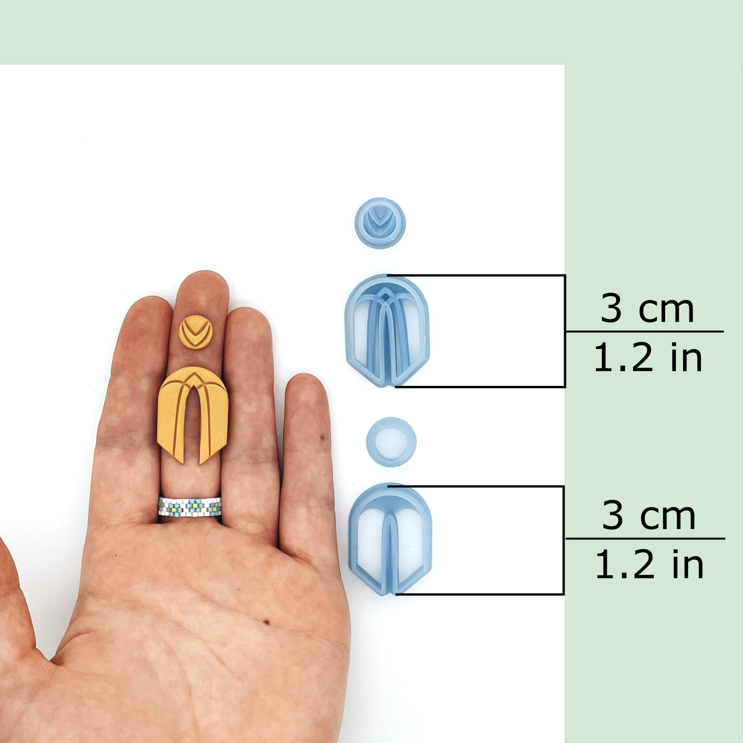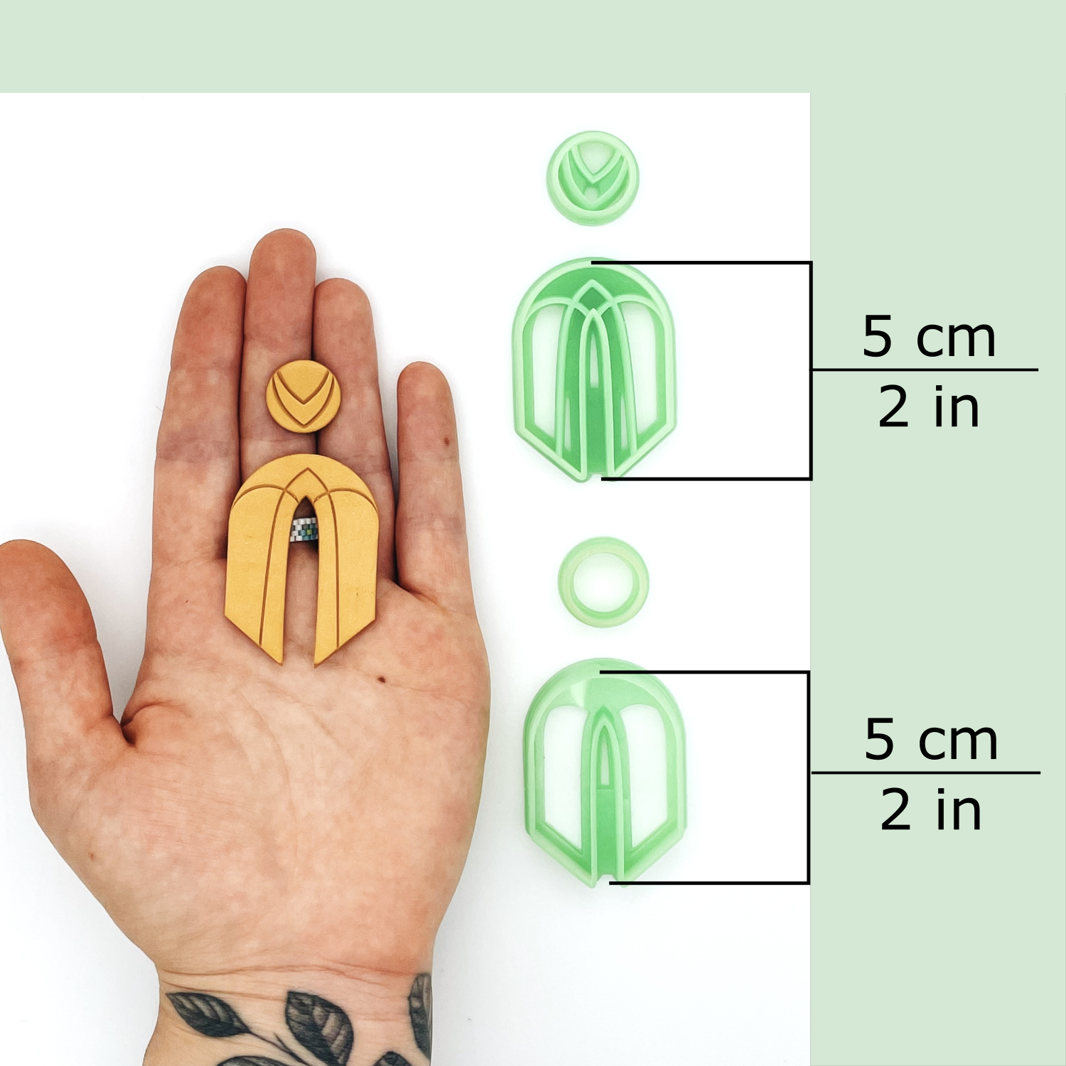 This Art Deco cutter set includes one U-shaped arch cutter (either the outline cutter or debossing cutter) and the matching stud cutter. There are three sizes available, 3 cm to 5 cm. Sizes are based on the height of the Arch dangle cutter, not the width.