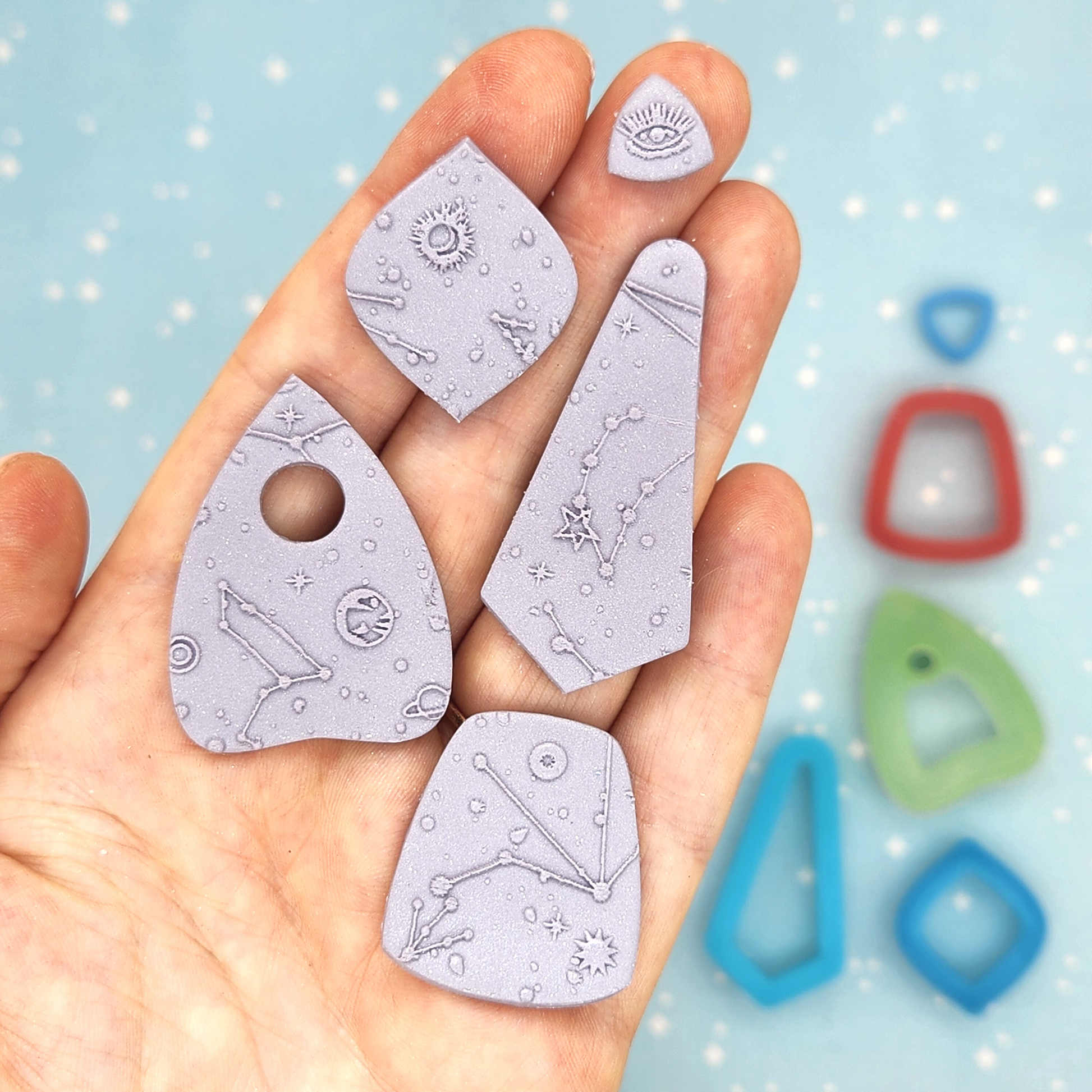 Seen here with the 5 cm Angular Teardrop cutter, 4 cm Spirit Borad Planchette outline cutter, 3 cm Miya outline cutter, 3 cm Brandy outline cutter, and a stud from the Tiny Stud Set.
