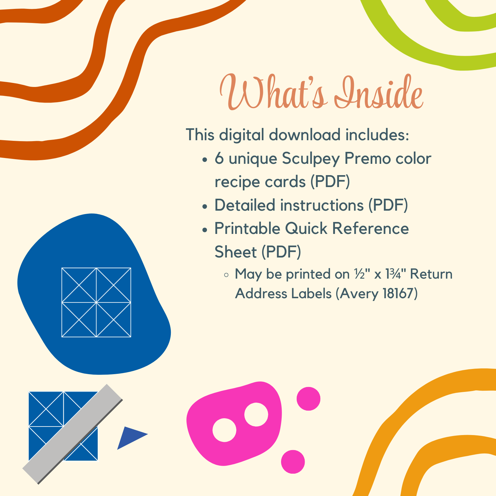 All recipes are mixed using just four Premo colorsāCobalt Blue, Fuchsia, Zinc Yellow, and White. Each recipe is broken down into clear, repeatable parts so you can reliably recreate colors across batches, whether youāre making earrings, charms, or faux candies.Ā