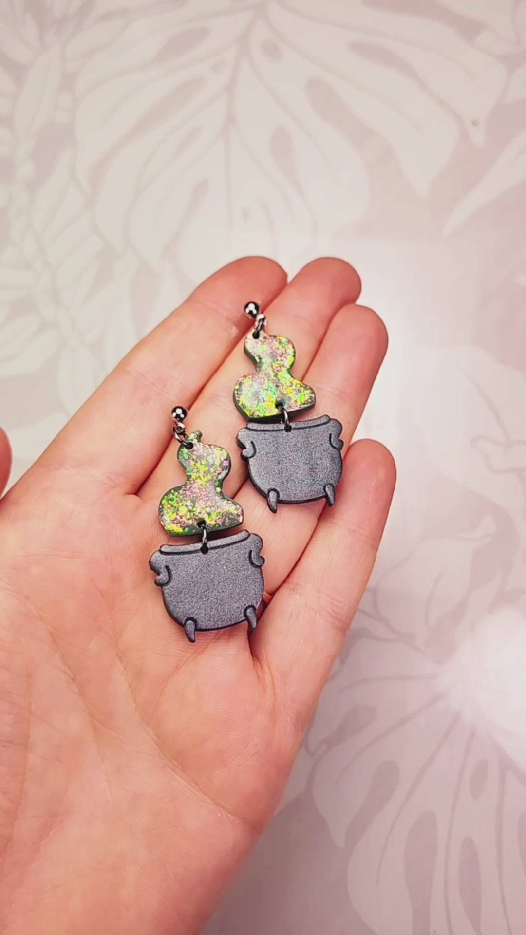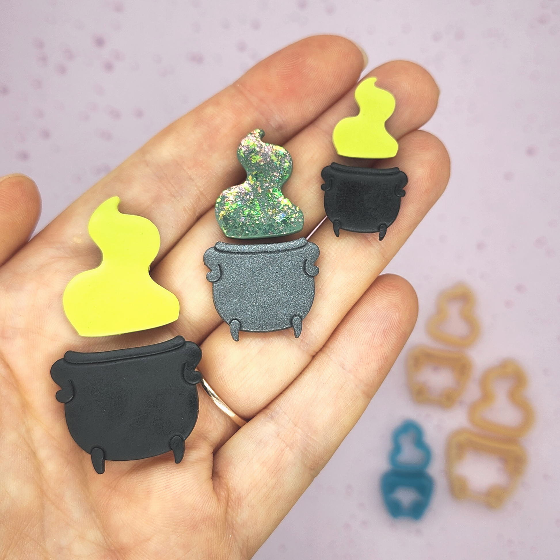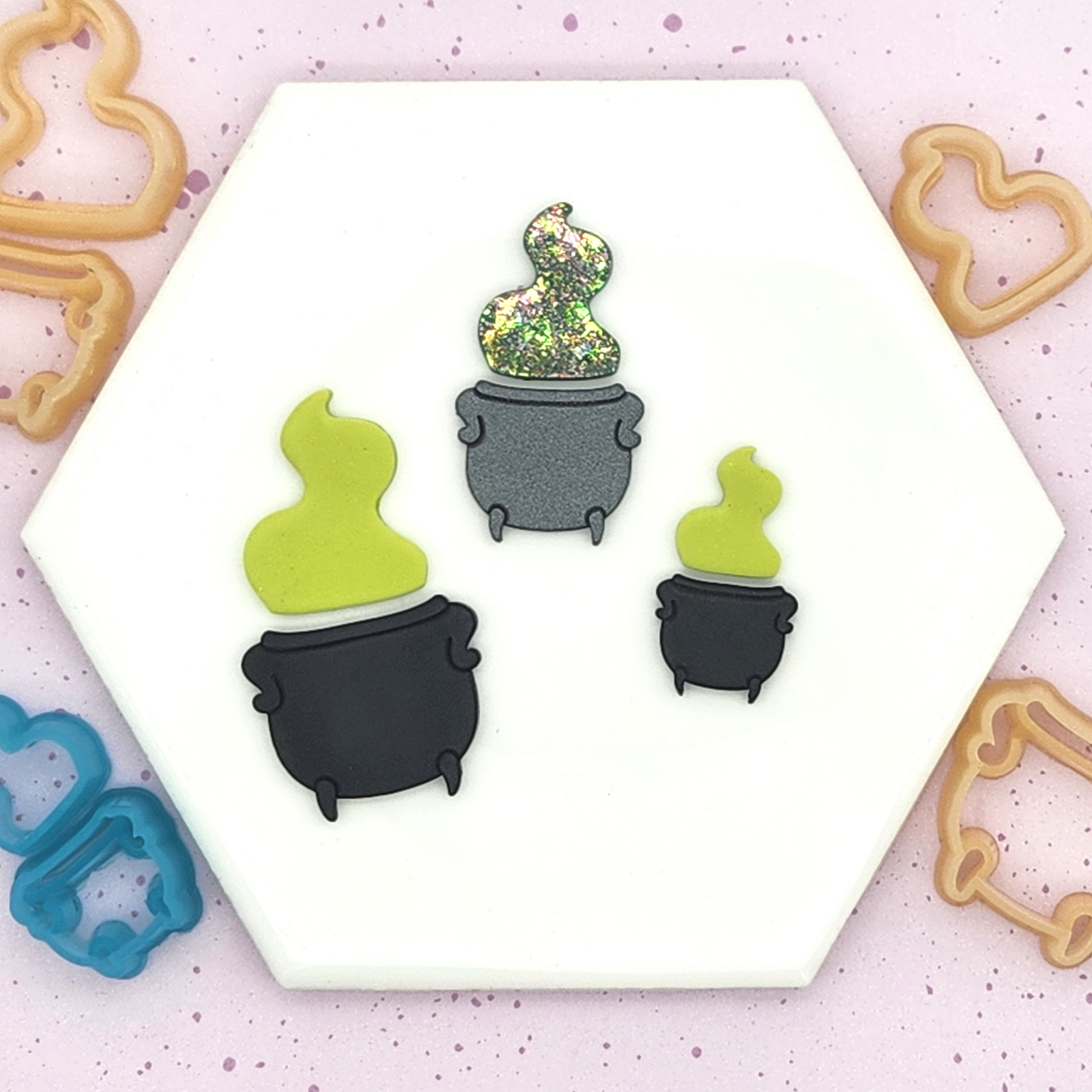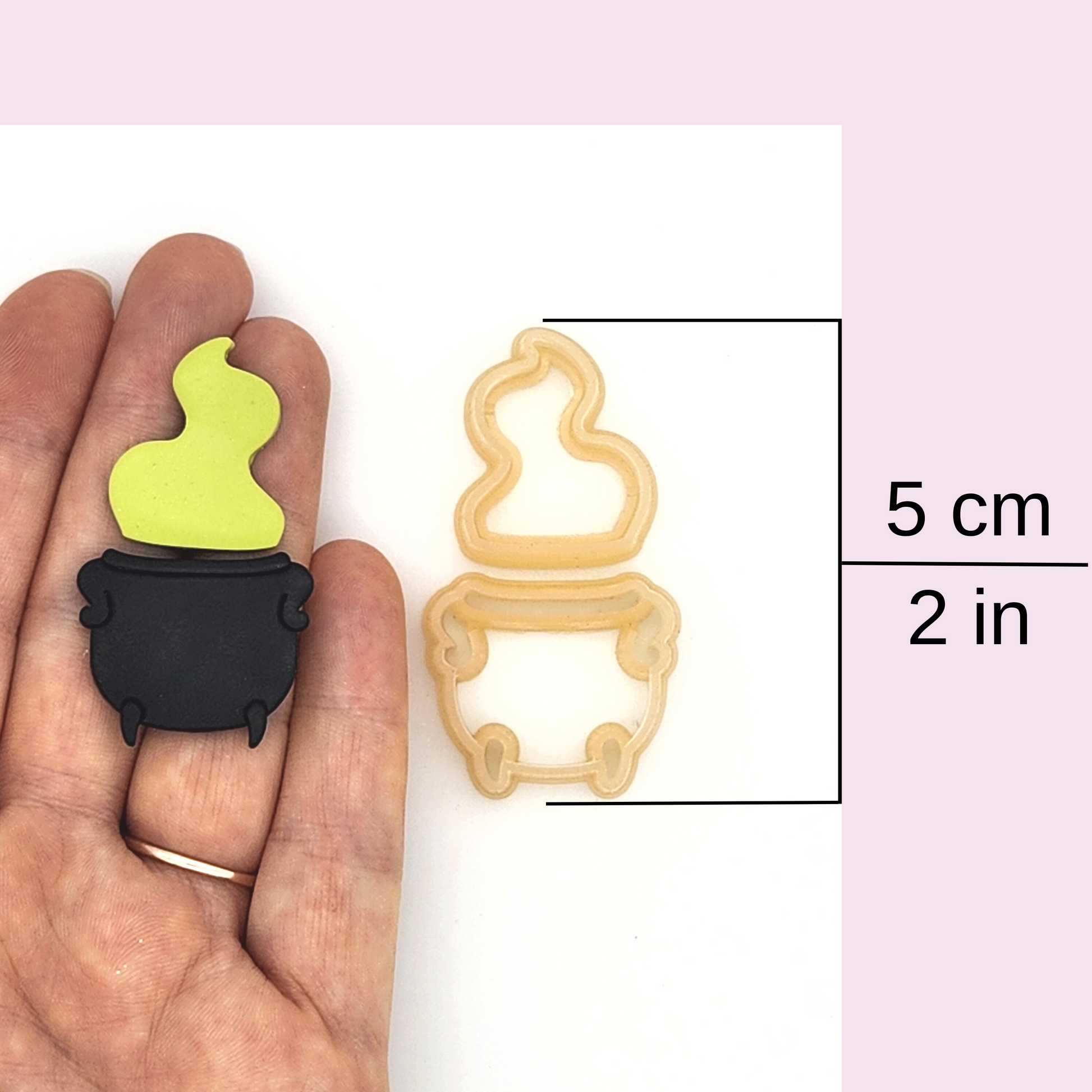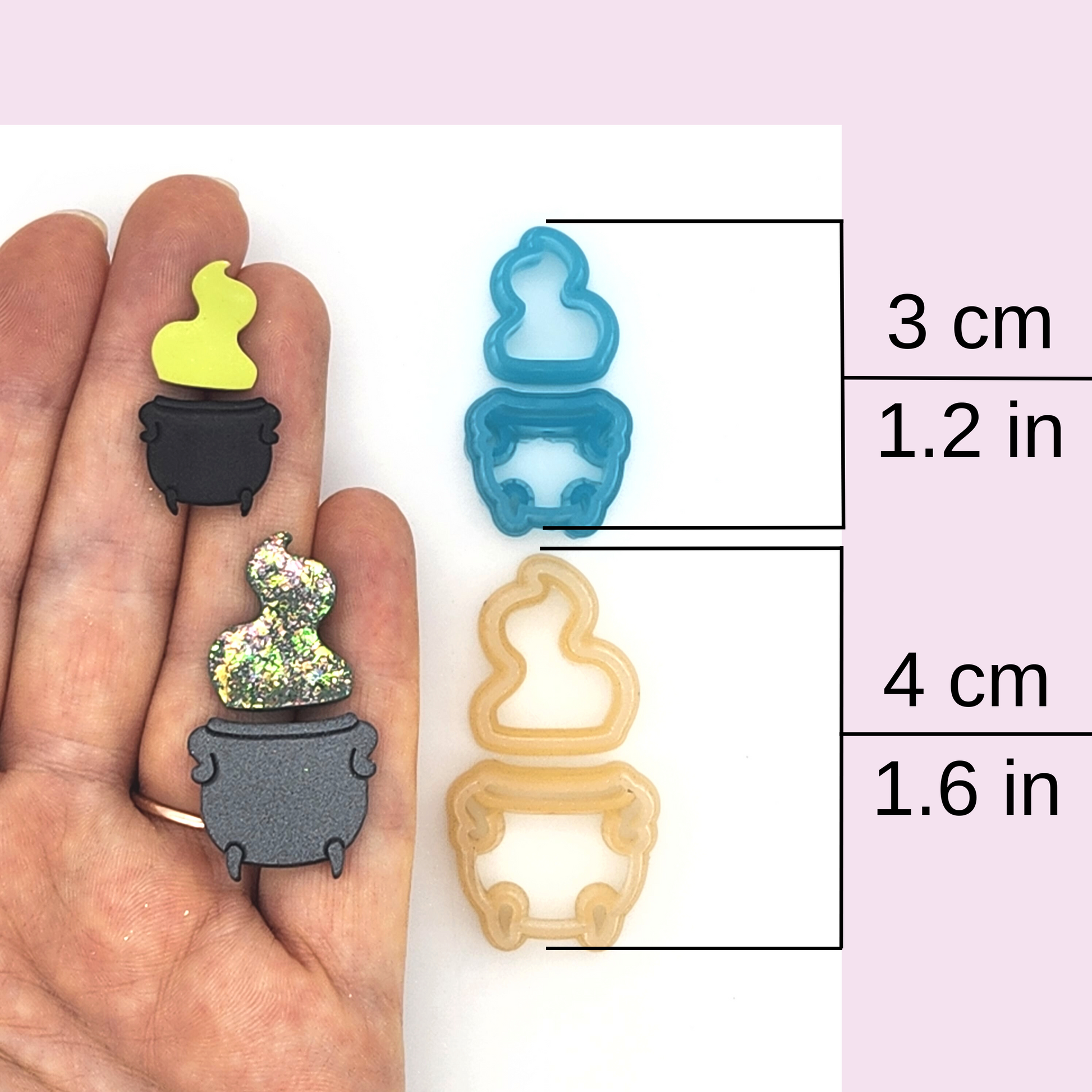This sassy cauldron polymer clay cutter set comes with two cutters, a cauldron and smoke. There are three sizes available, 3 cm to 5 cm. The dimensions are from the top of the smoke to the bottom of the cauldron.