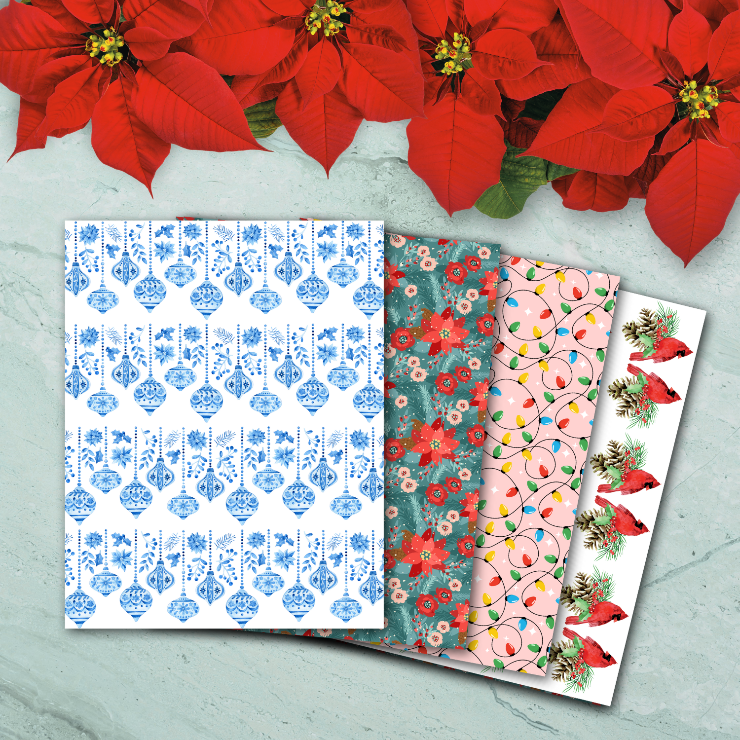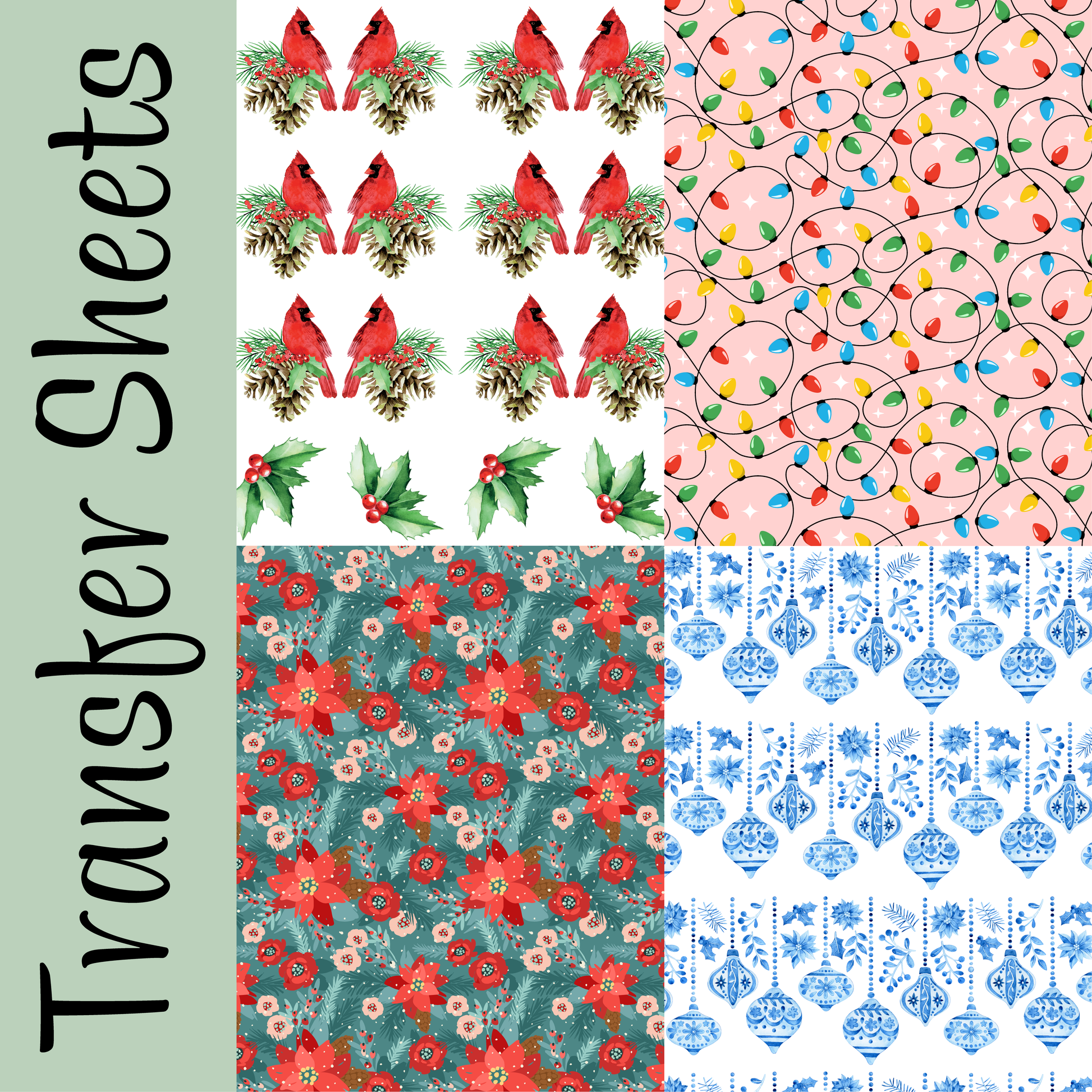 Our water-soluble transfer sheets are designed for use with polymer clay, offering a simple way to add colorful designs to your projects. This is a set of four Christmas themed transfer sheets. The set includes one of each of the following patterns: Vintage Blue Baubles, Christmas Cardinals, Twinkling Christmas Lights, and Snowy Poinsettias.
