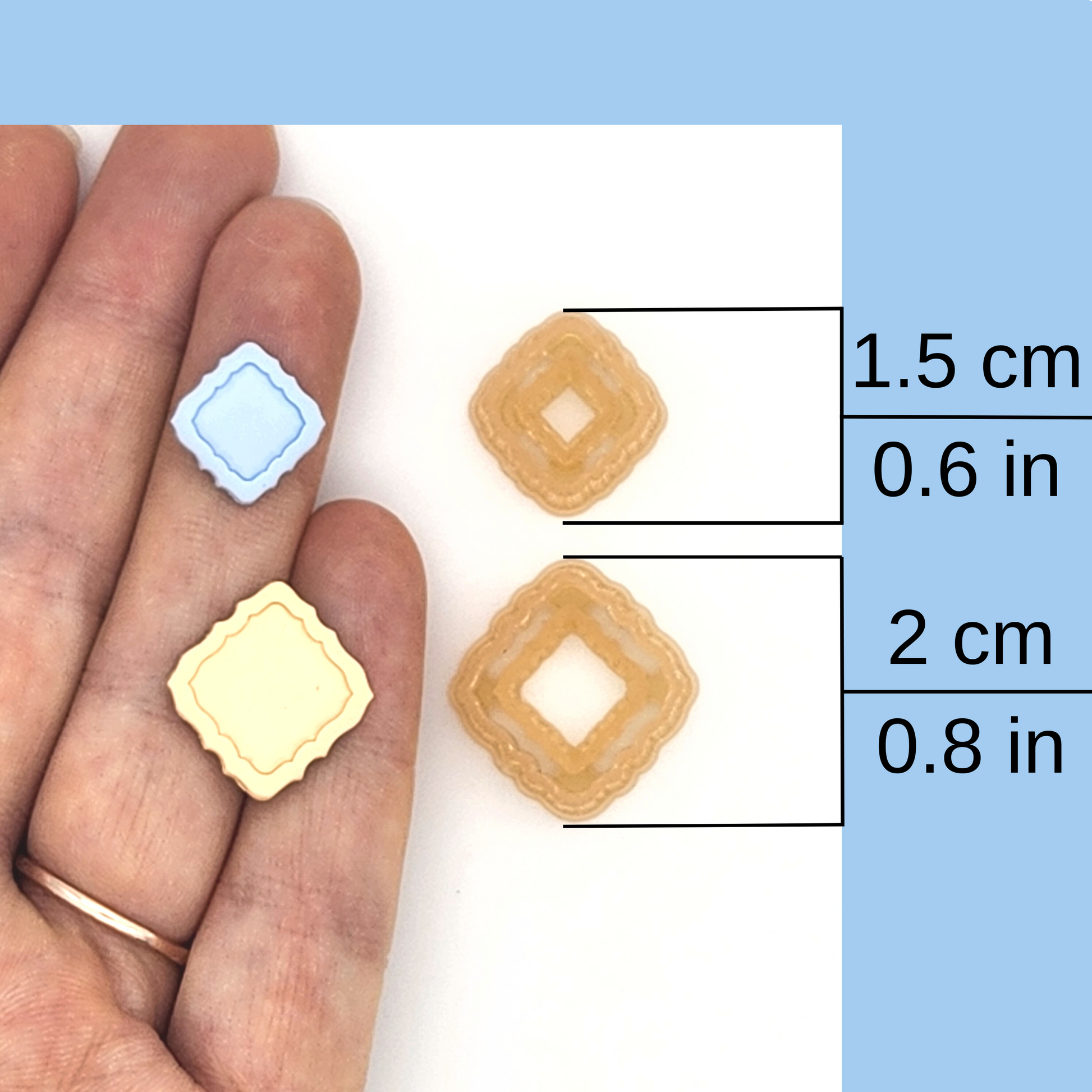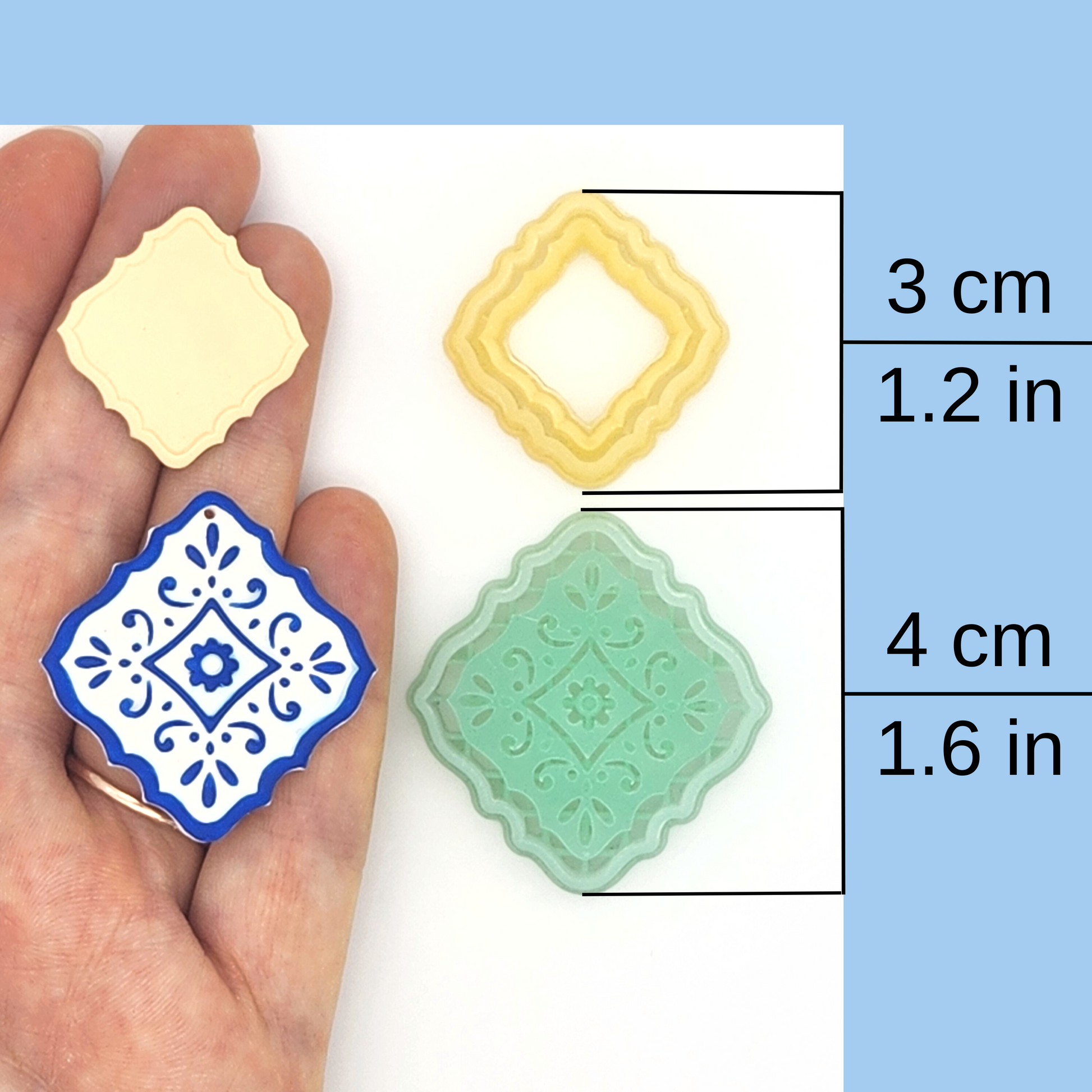 This Moroccan polymer clay cutter comes in four sizes, 1.5 to 4 cm. The larger sizes are also available in two styles, Simple Frame Debossing and Detailed Debossing cutters.