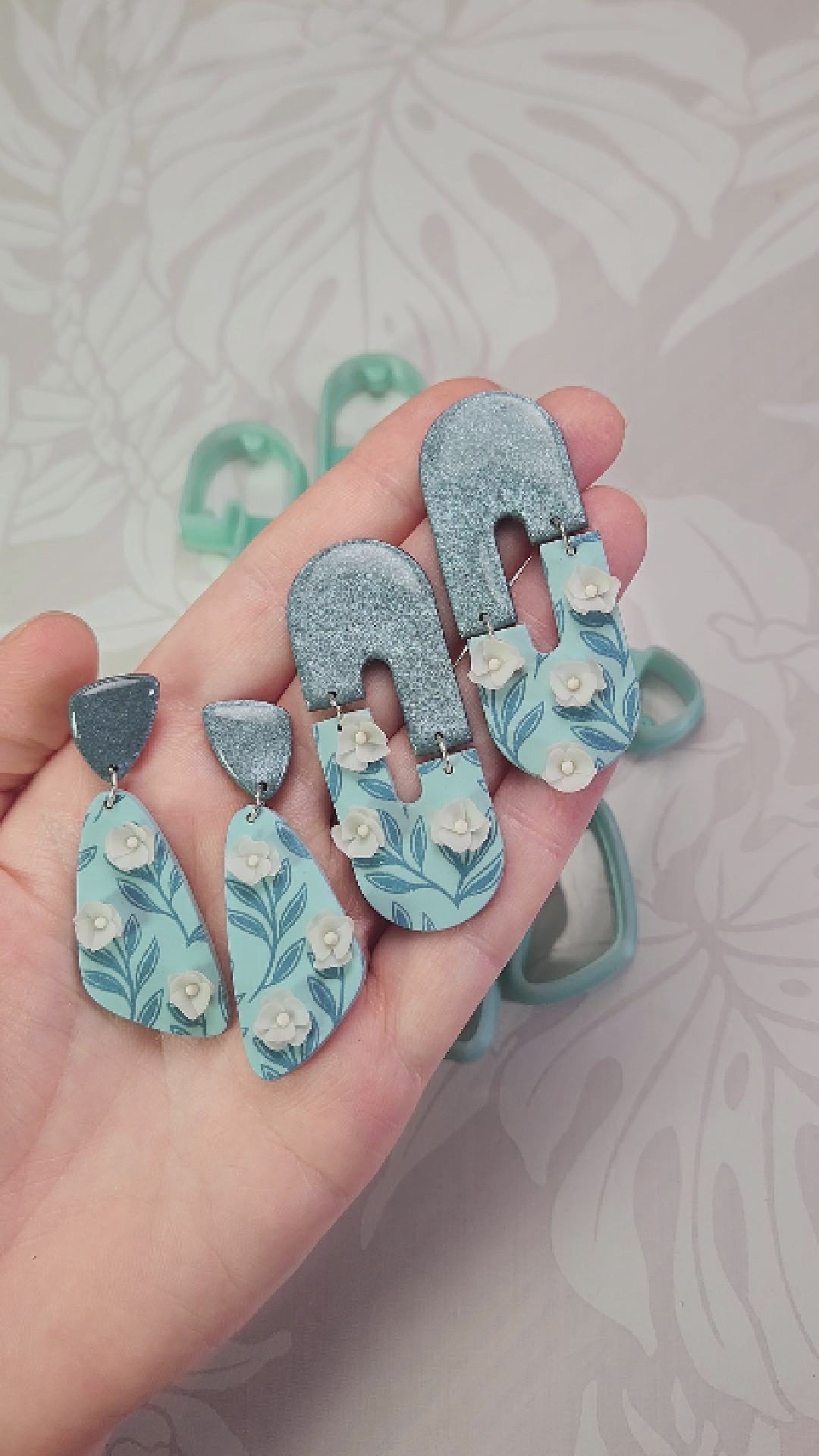 Seen here with a 1.5 cm Circle cutter, 2 cm hexagon shaped Miranda outline cutter, 3 cm trapezoid shaped Mia outline cutter, 4 cm triangular teardrop Josie mirrored cutter set, and the 6 cm Rochelle Duet cutter set.Ā