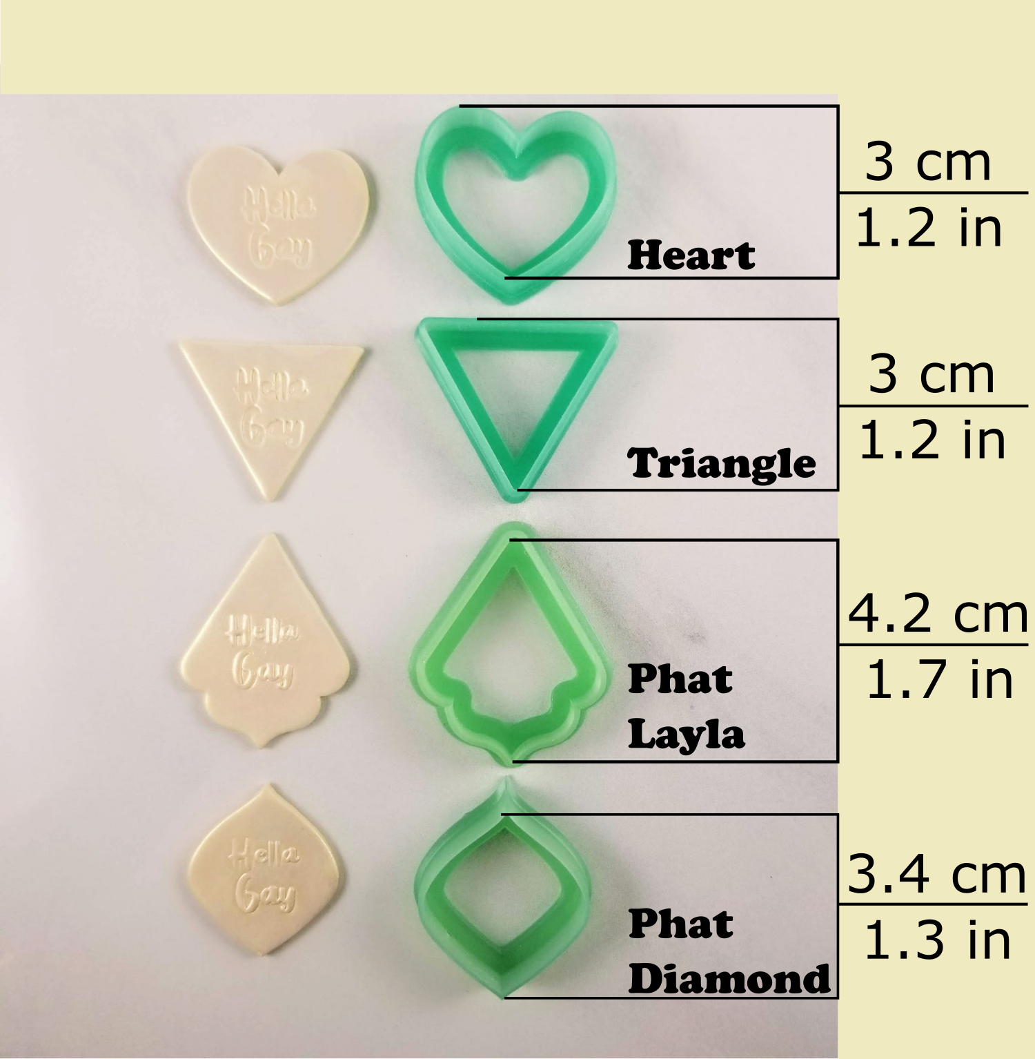 There are four cutters available that work well with the embossed/debossed words. If you use different cutters with these tiles, please make sure they are less than 5cm/2in long and wide so that the impression from the edge of the tile doesn't show.