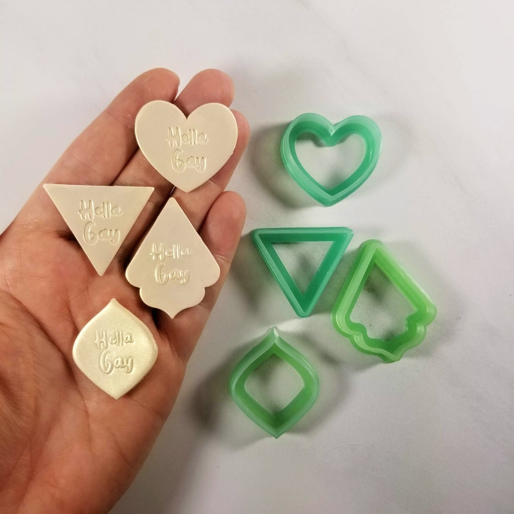 These tiles are two-sided, with "Hella Gay" on both sides. One side is embossing, the other is debossing.