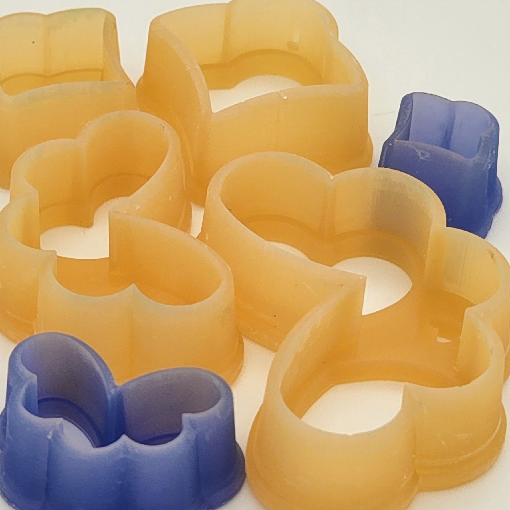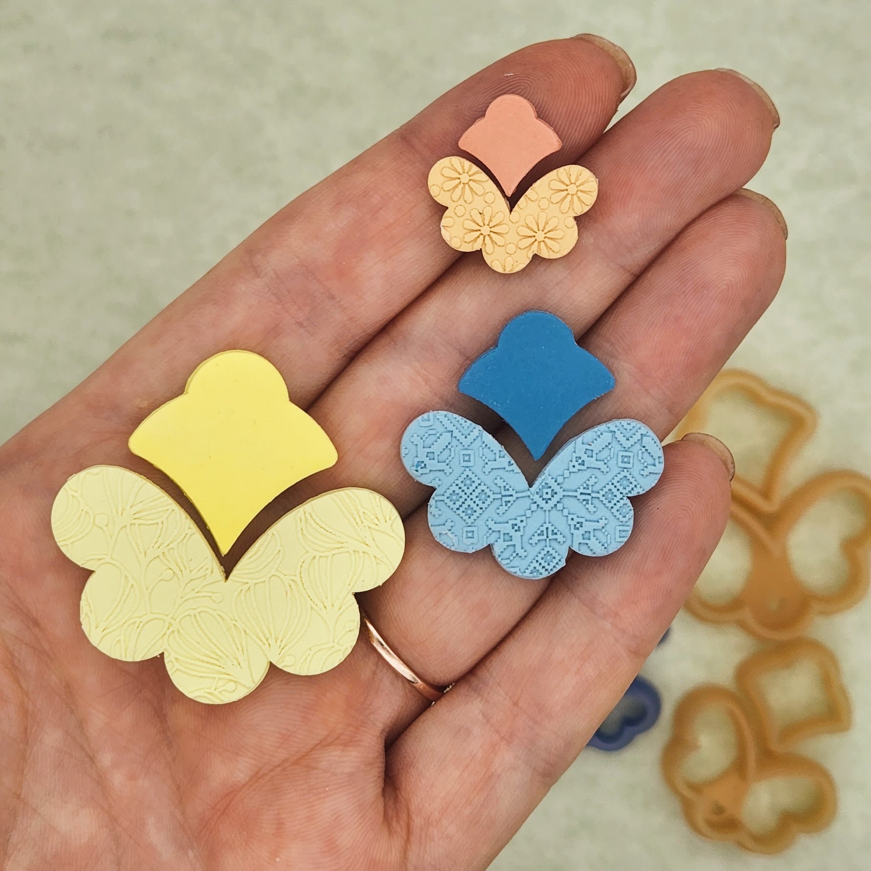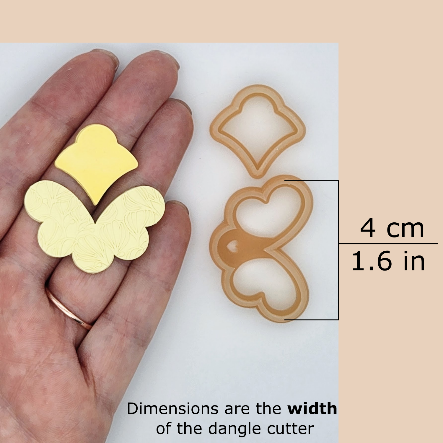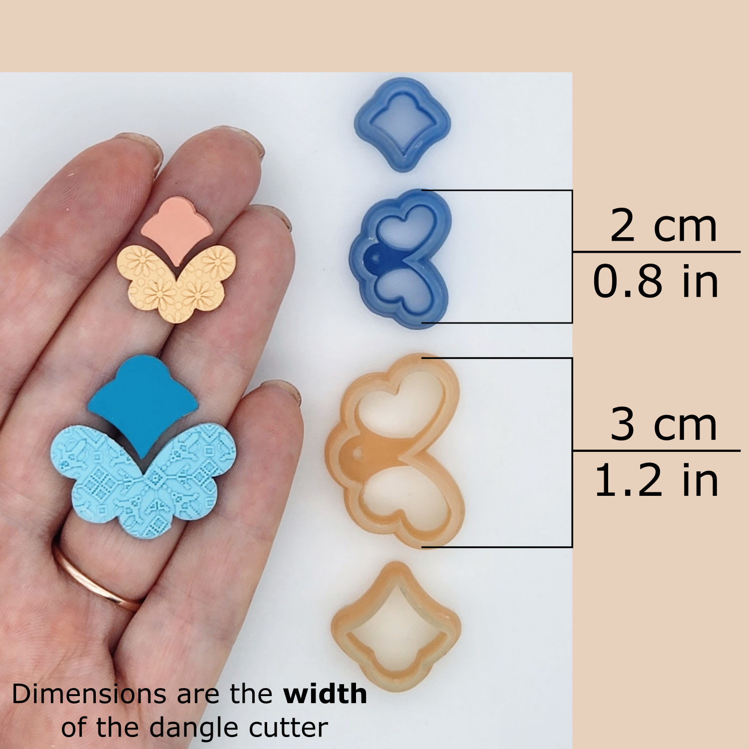 This polymer clay cutter set includes one outline cutter and the matching stud cutter. There are three sizes available, 2 cm to 4 cm. Sizes are based on the width of the cutter, not the height.