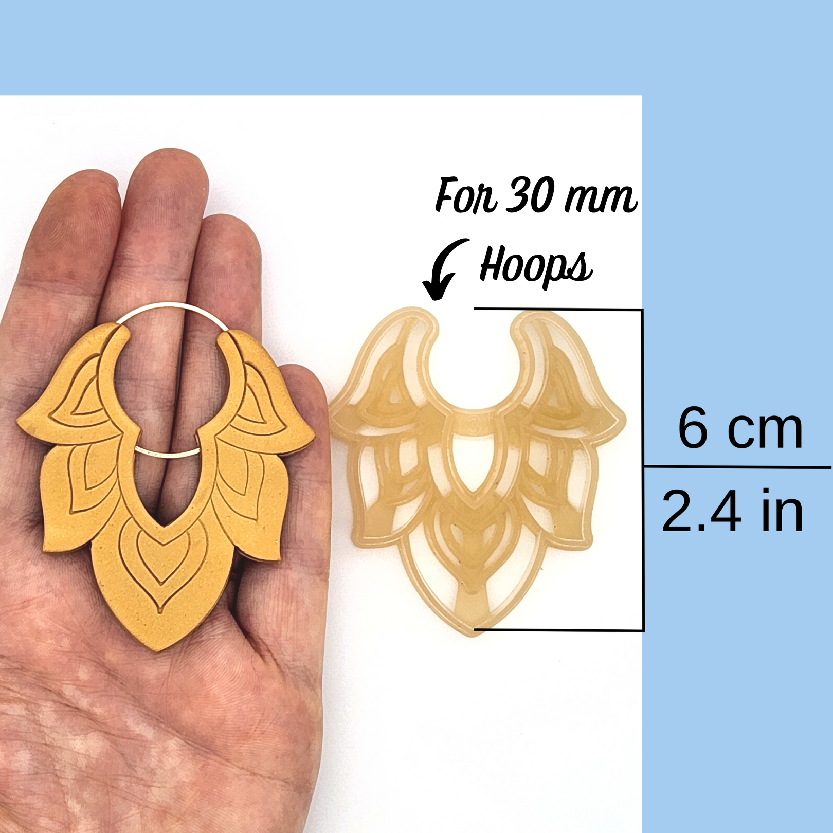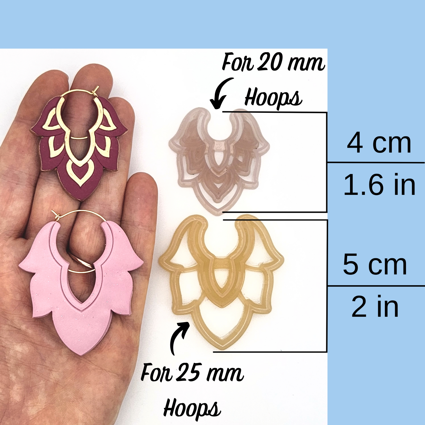This Moroccan polymer clay cutter can be used to embed hoop earring findings. The set includes two cutters, a debossed front cutter and a back cutter, which leaves an impression for the hoop. These cutters can be used with 20, 25, and 30 mm wine charm wire hoops, hinged hoops, endless hoops, and closed hoops. There are also two styles available for the front cutter, Simple Debossing and Detailed Debossing. Each style is available in three sizes: 4 cm (for 20 mm hoops), 5 cm (for 25 mm hoops), and 6 cm (for 30 mm hoops).
