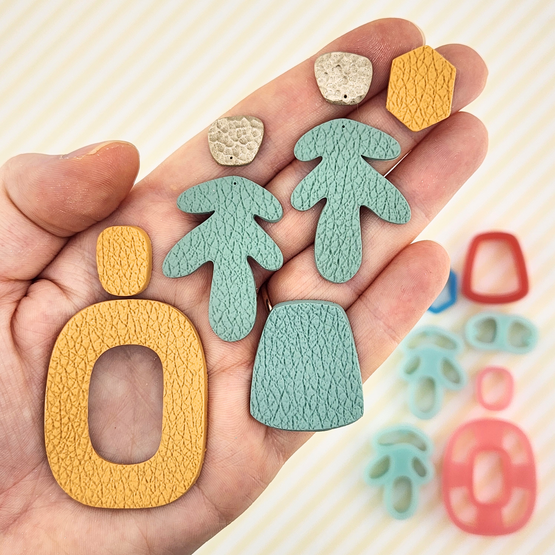 Seen here with the 2 cm hexagon shaped Miranda outline cutter, 3 cm trapezoid shaped Brandy outline cutter, 4 cm organic shapedĀ Emilia cutters, and the 5 cm Adeline doughnut cutters.Ā