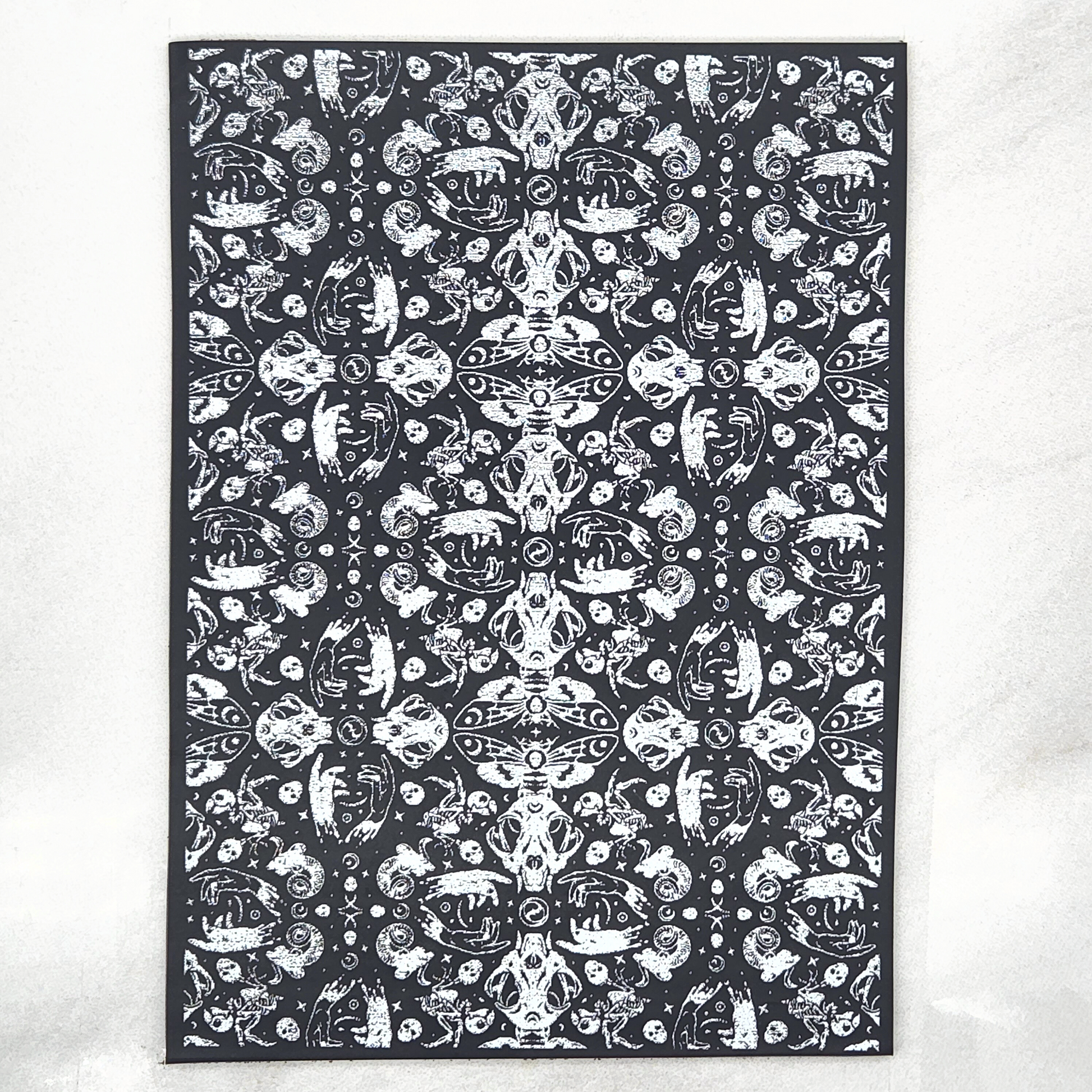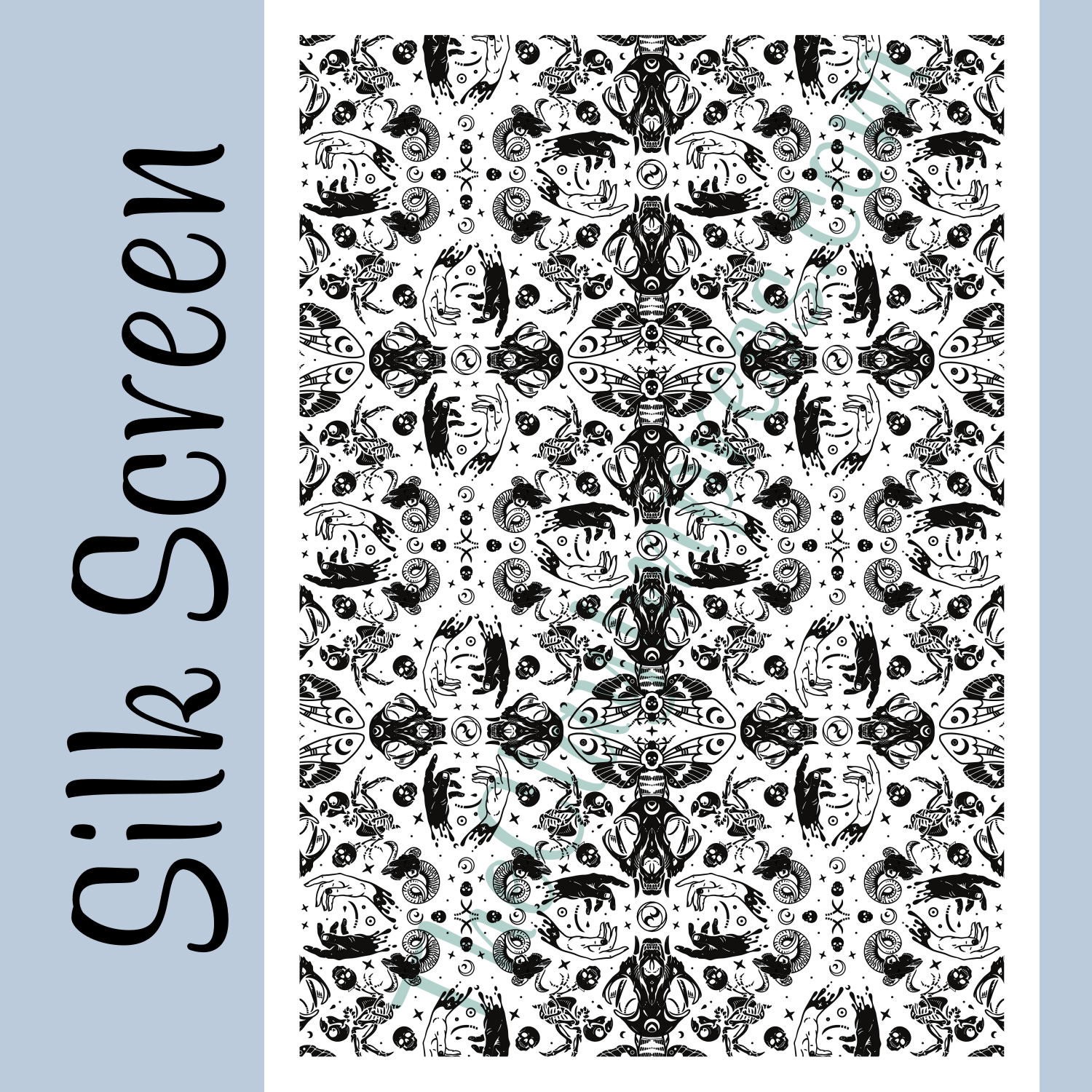ThisĀ MagickĀ silk screen features hands, moths, and skulls. It can be used on polymer clay with heavy body acrylic paint, mica powders,Ā or fine chalk pastels.Ā