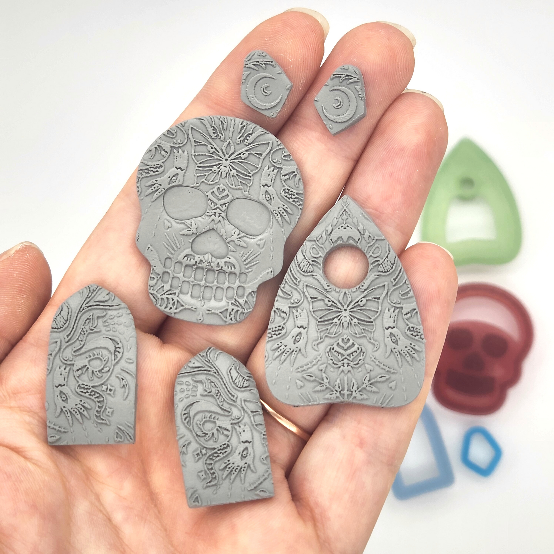 Seen here with the 3 cm Art Deco Ogive outline cutter, 4 cm Planchette outline cutter, 4 cm Skull cutter, and a stud cutter from the Tiny Stud Set.Ā