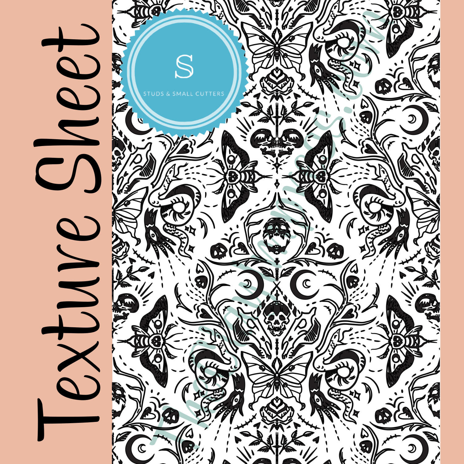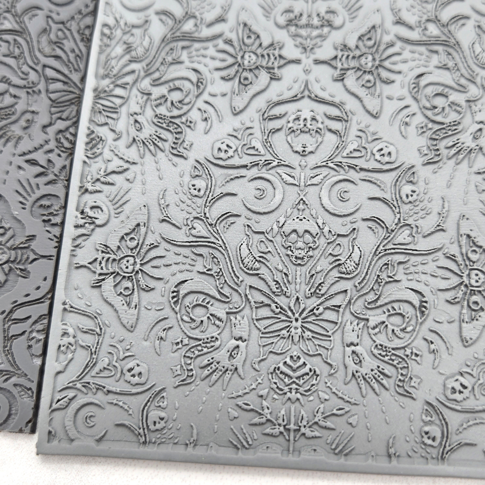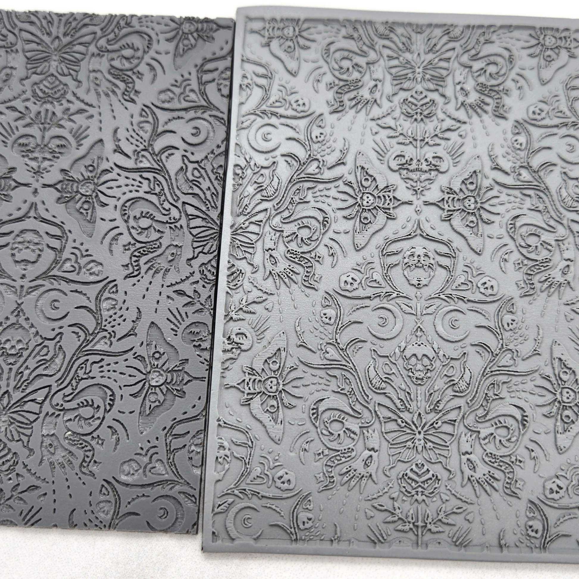 Rubber polymer clay texture sheet with moth, skull, and snake embossing details. (When pressed into clay, the pattern will appear to stand out.)Ā