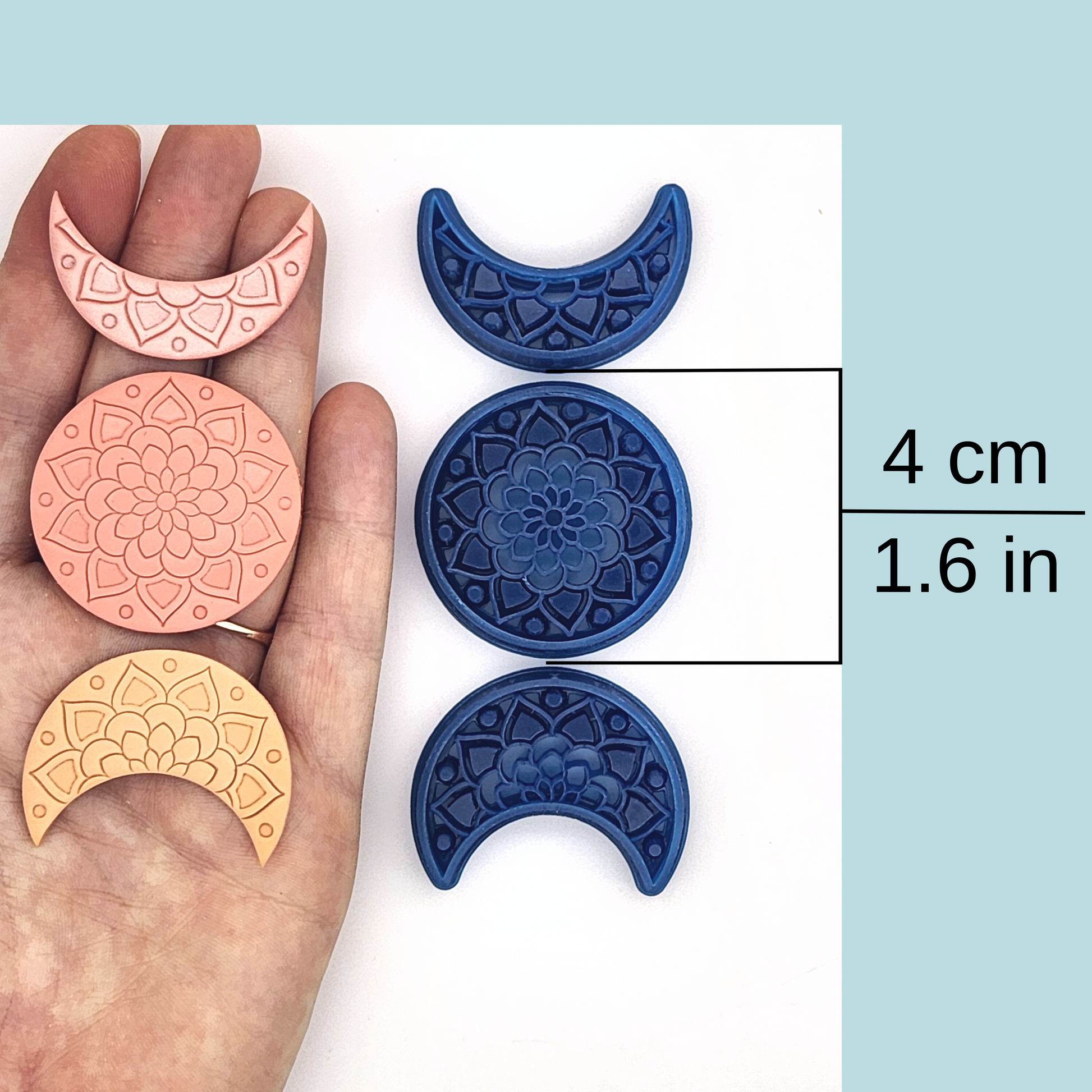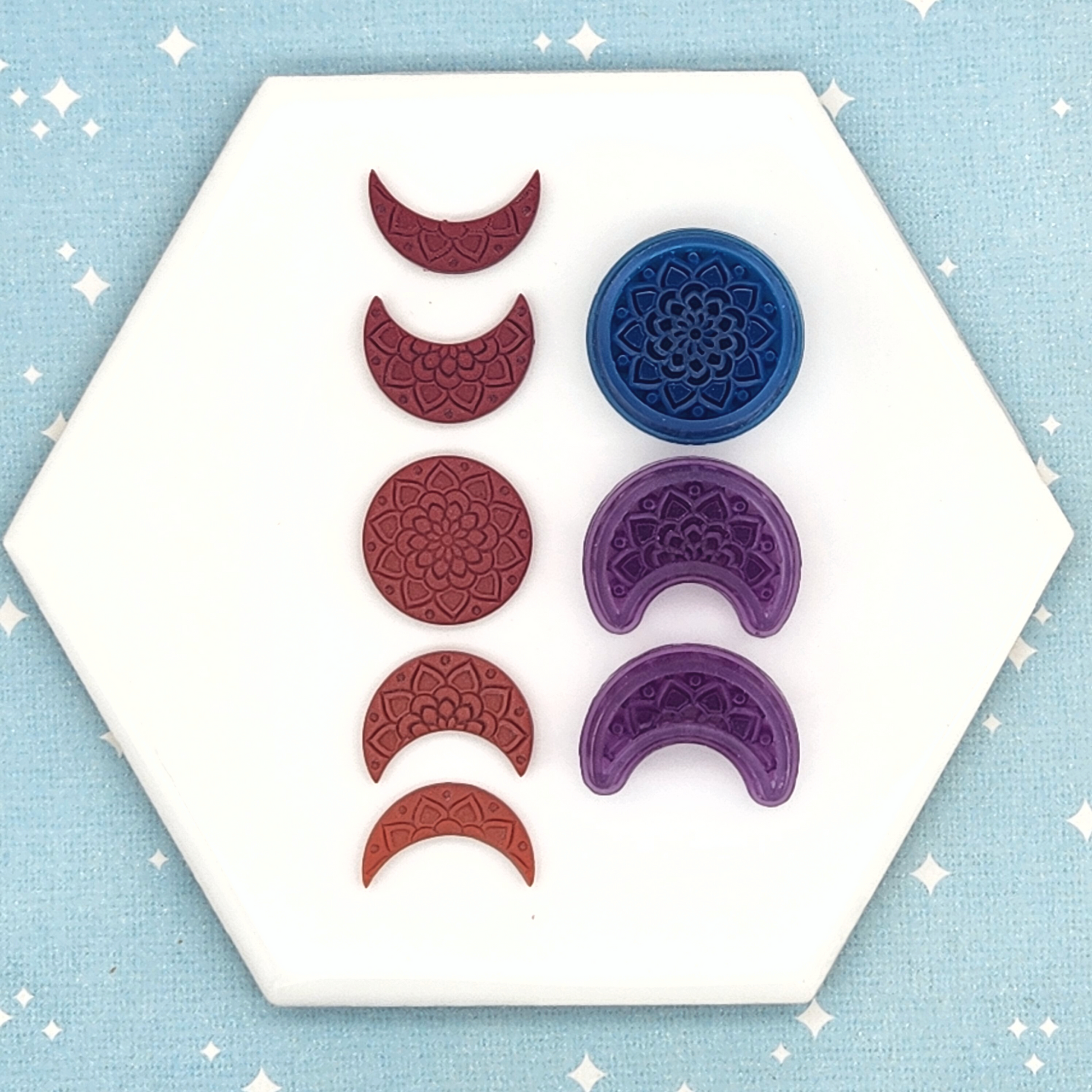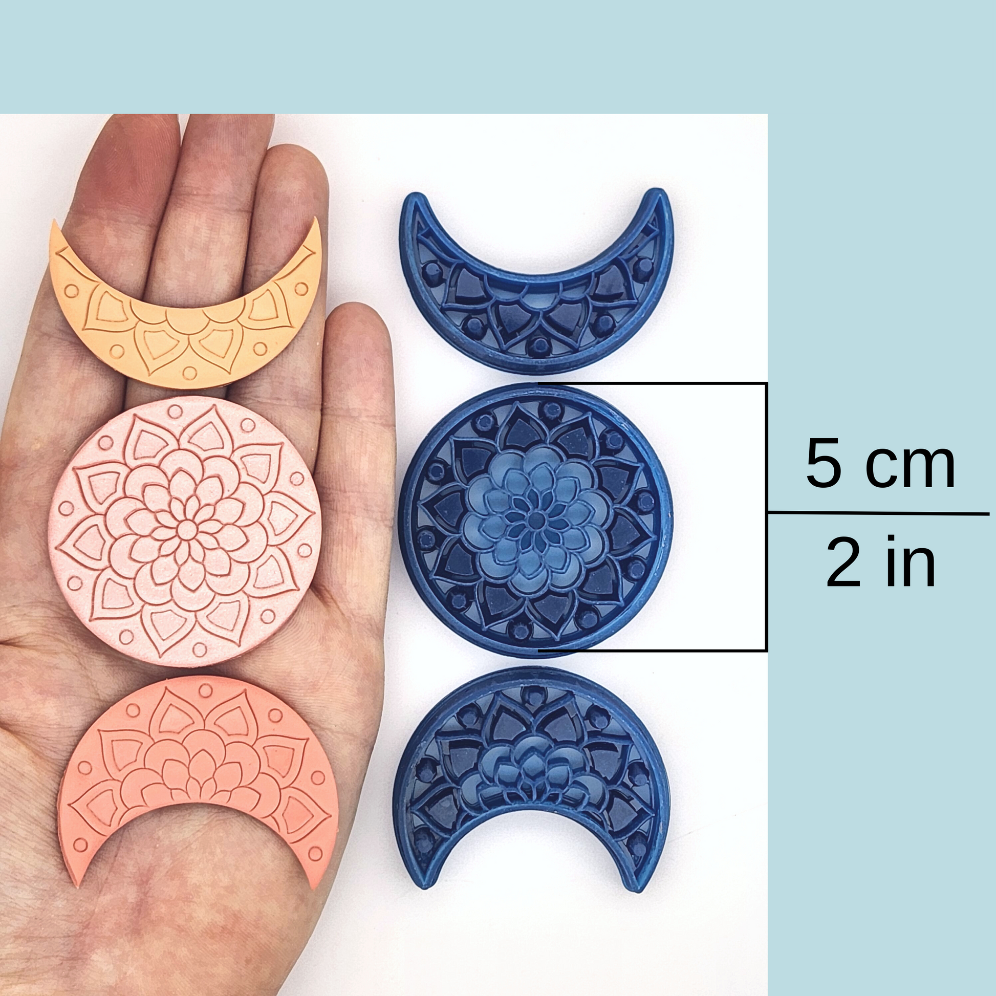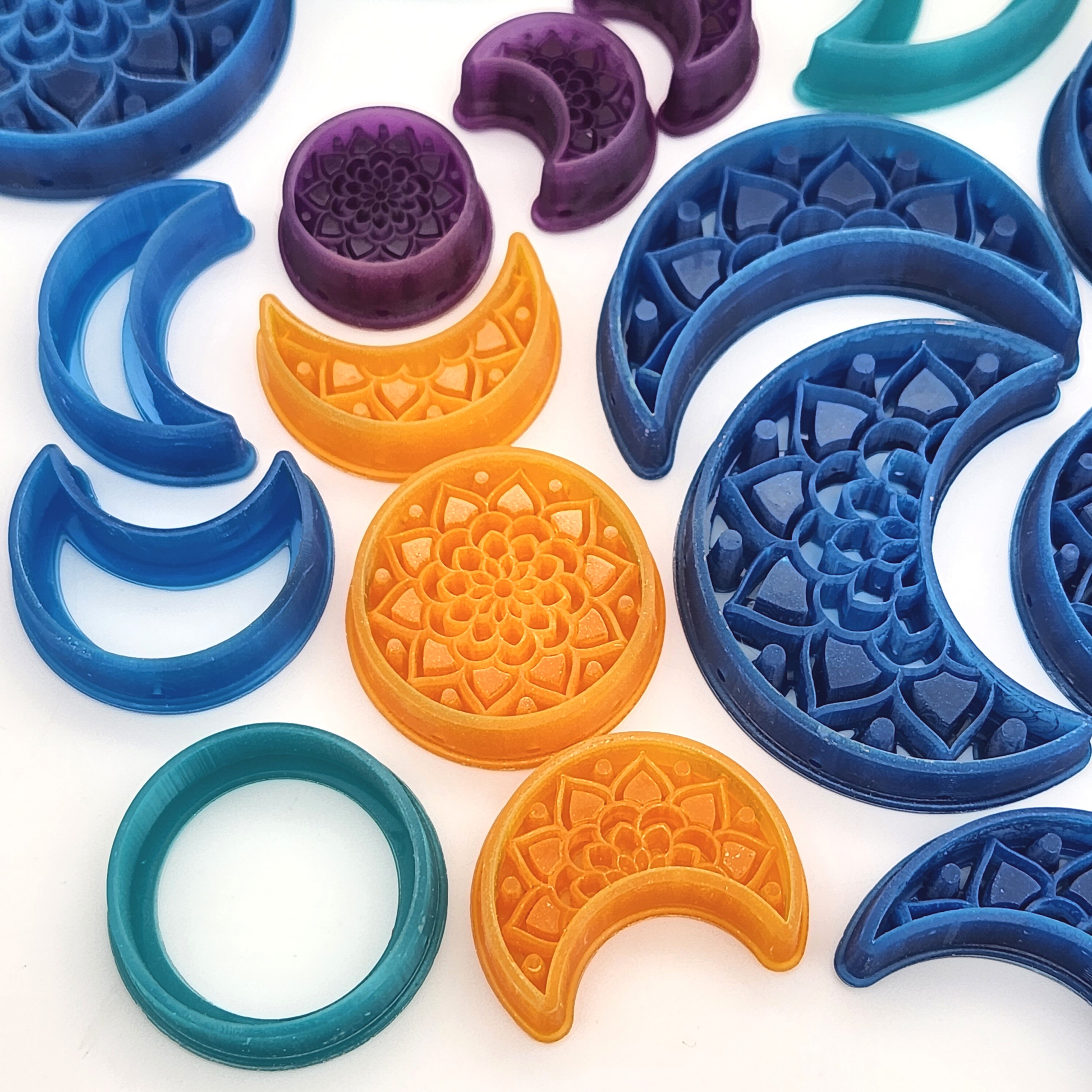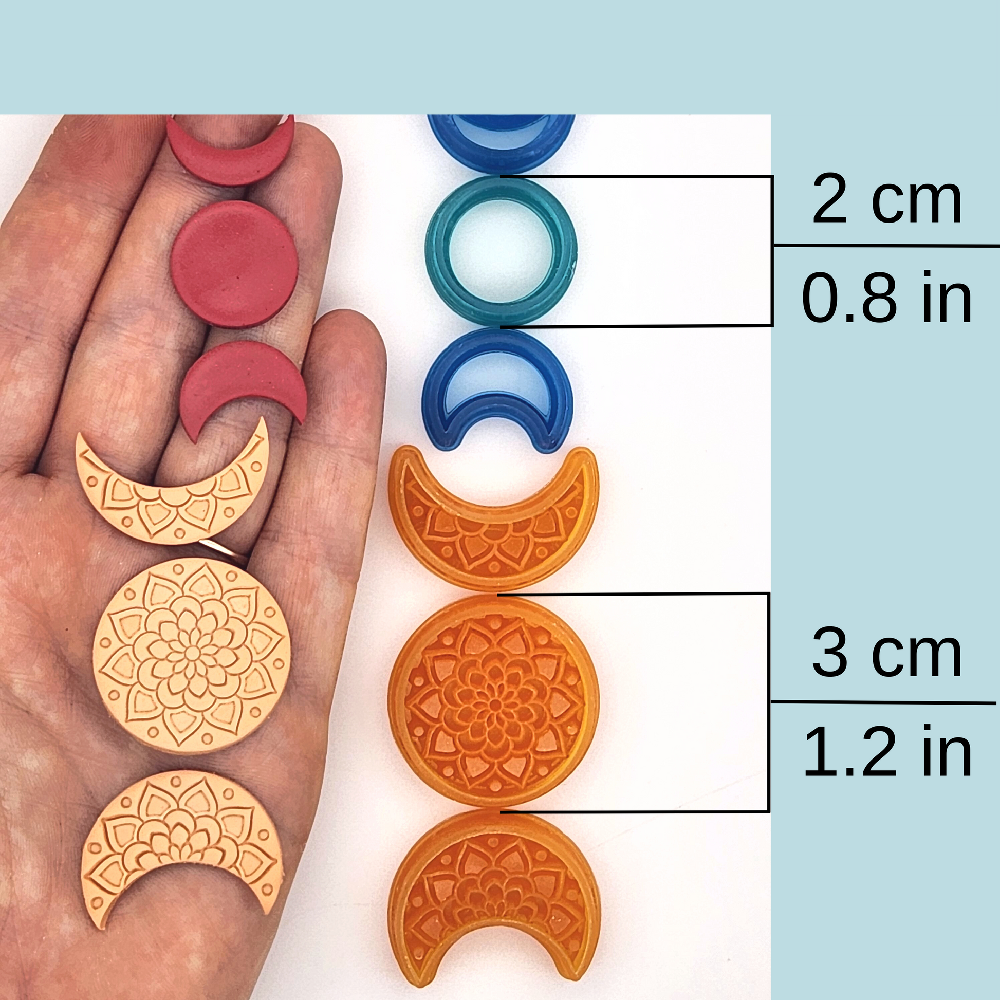 This set of mandala moon phase polymer clay cutters includes three cutters: a full moon and two crescent moons at slightly different phases. The set is available as a debossing set with mandala details, or as a plain outline set. Each set is also available in four sizes: 2 to 5 cm. The 2 cm set is the best size for creating moon phase dangles!