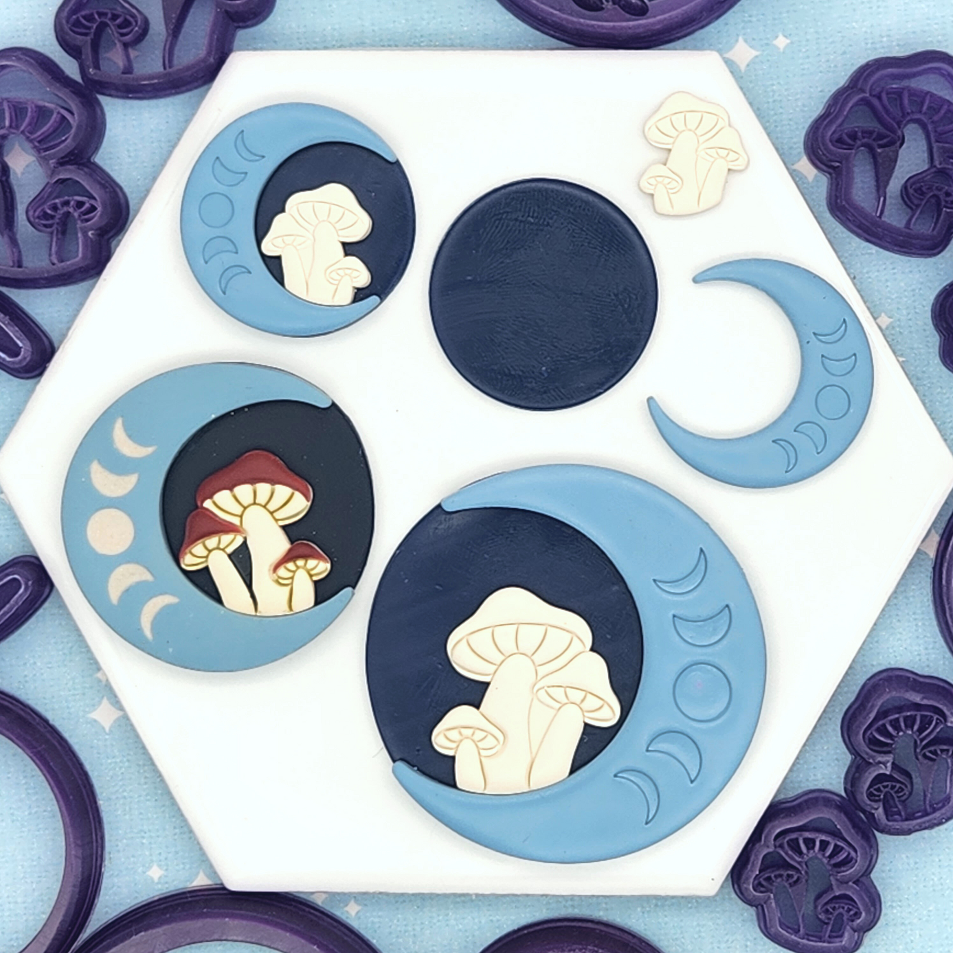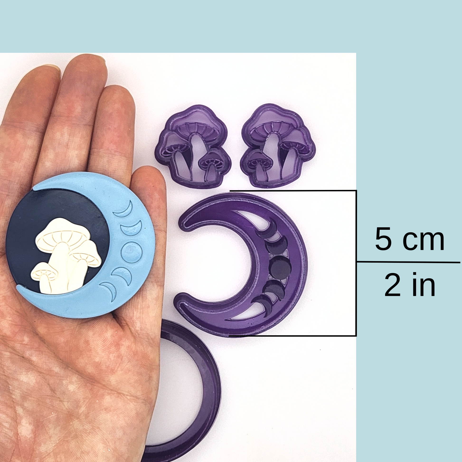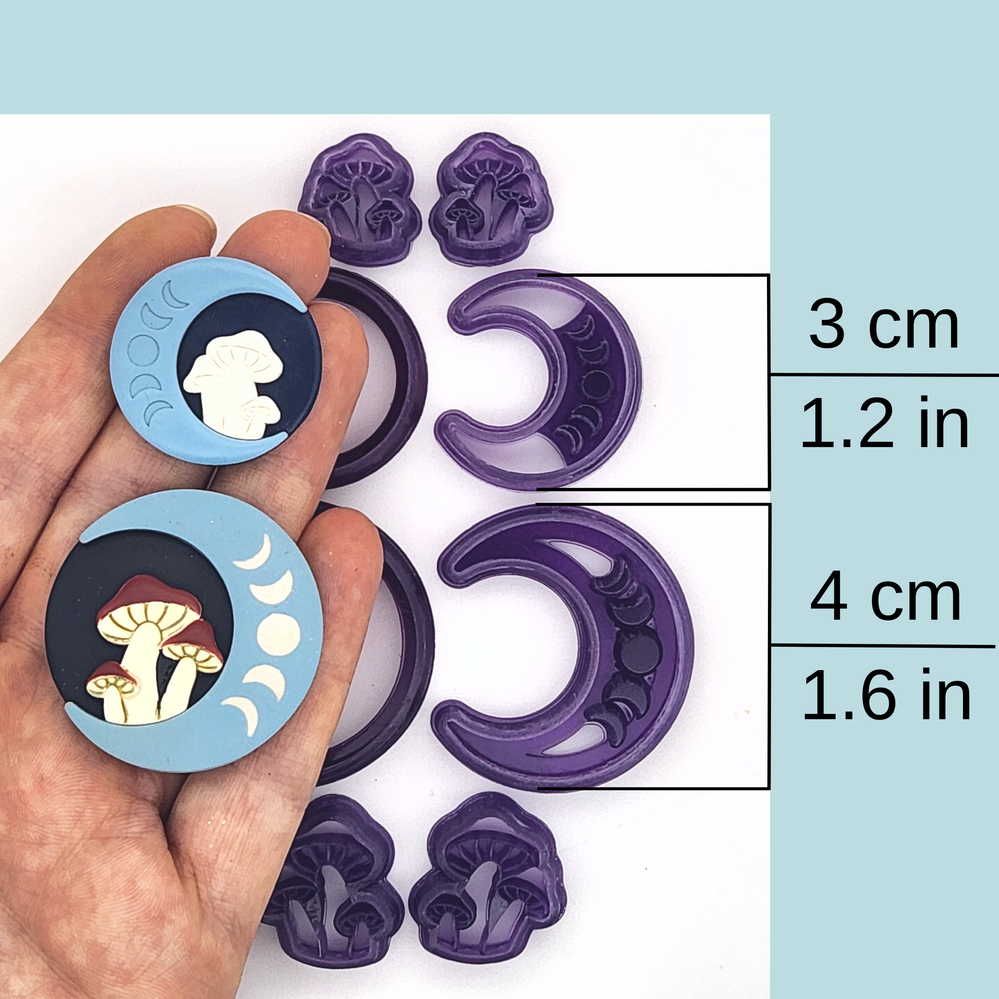 This set of mirrored moon with mushrooms polymer clay cutters comes in three sizes, 3 cm to 5 cm. Each set comes with four cutters: a background circle cutter, a symmetrical moon cutter (that can be mirrored by flipping it around), and two mirrored cluster-of-mushrooms cutters.