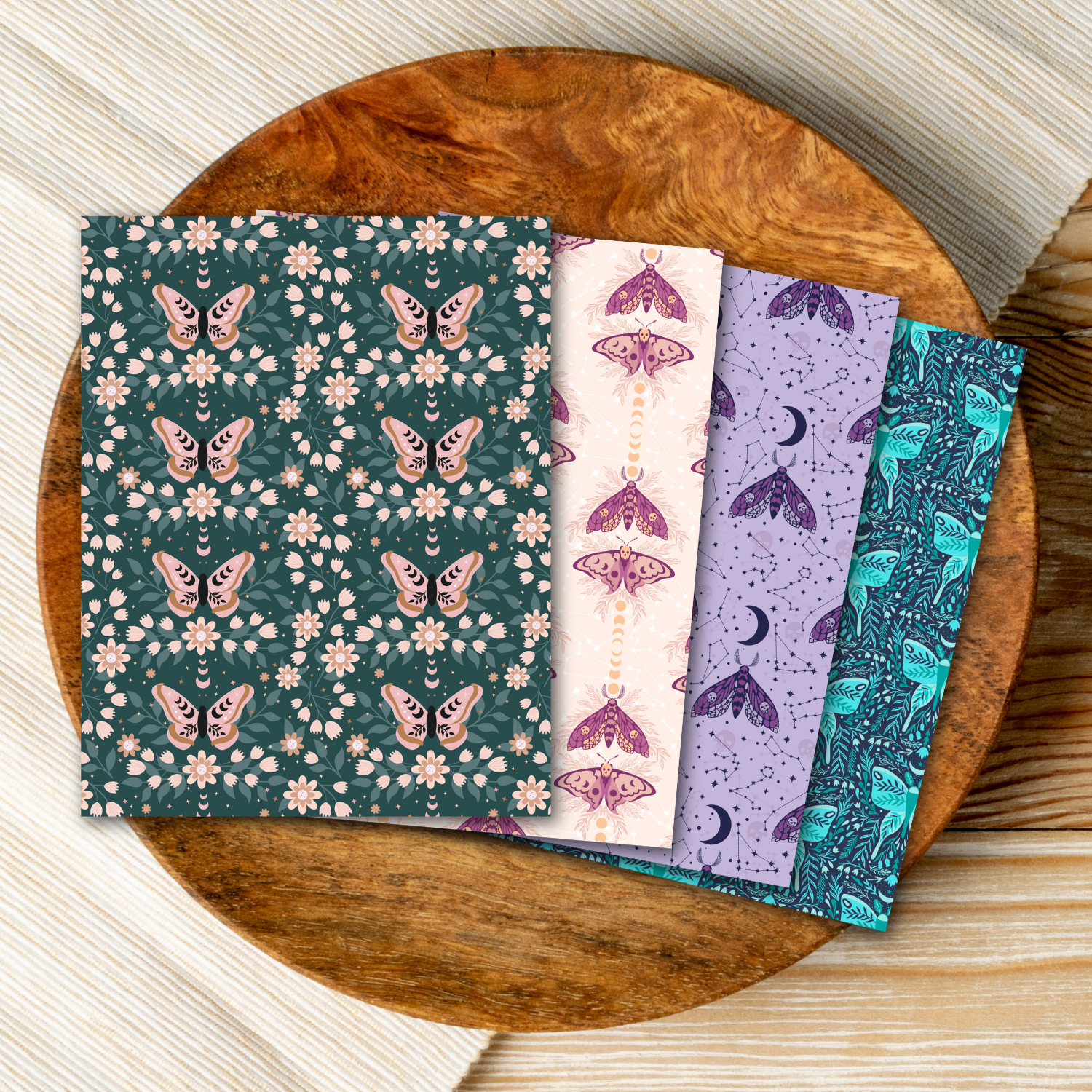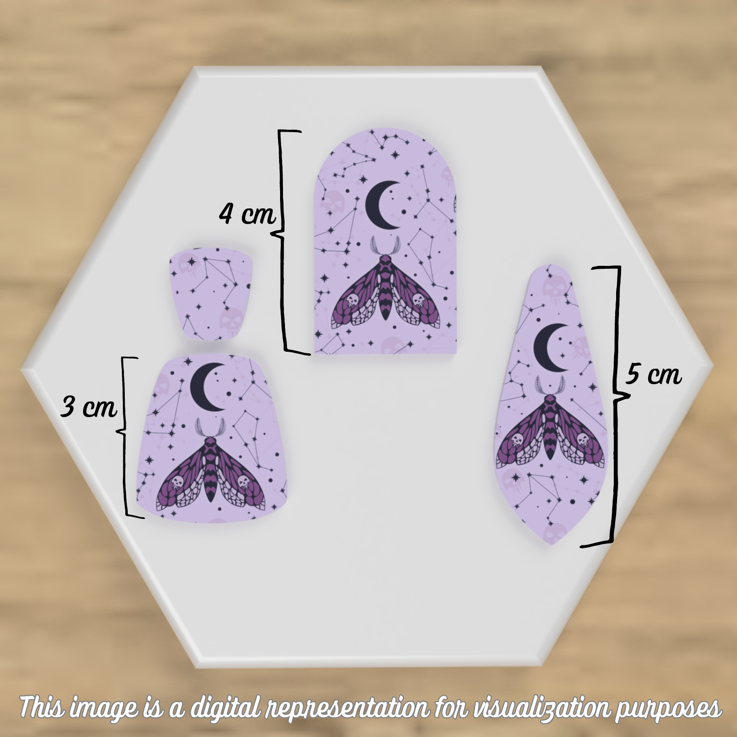 Our water-soluble transfer sheets are designed for use with polymer clay, offering a simple way to add colorful designs to your projects. This is a set of four Celestial Moth themed transfer sheets. The set includes one of each of the following patterns: Cosmic Purple Moths, Celestial Moths, Lunar Death Moths, and Blue Moon Moths.