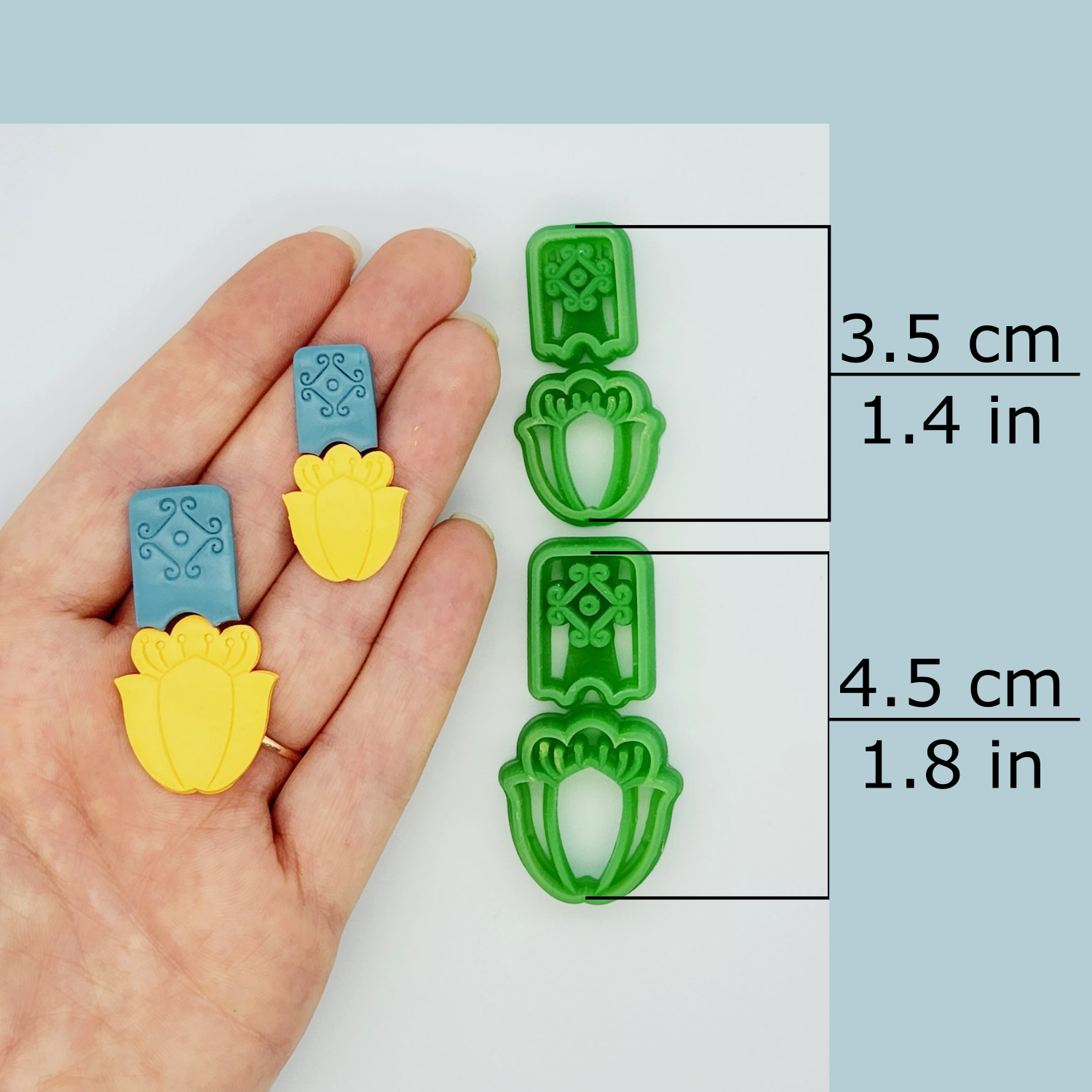 This set includes one debossing Ukrainian Flower cutter and the matching debossing stud cutter. There are two sizes available, 3.5 and 4.5 cm. The dimensions listed are the size of the flower and stud together. When assembled, this piece will be slightly taller than the listed dimensions, depending on which size jump ring you use.