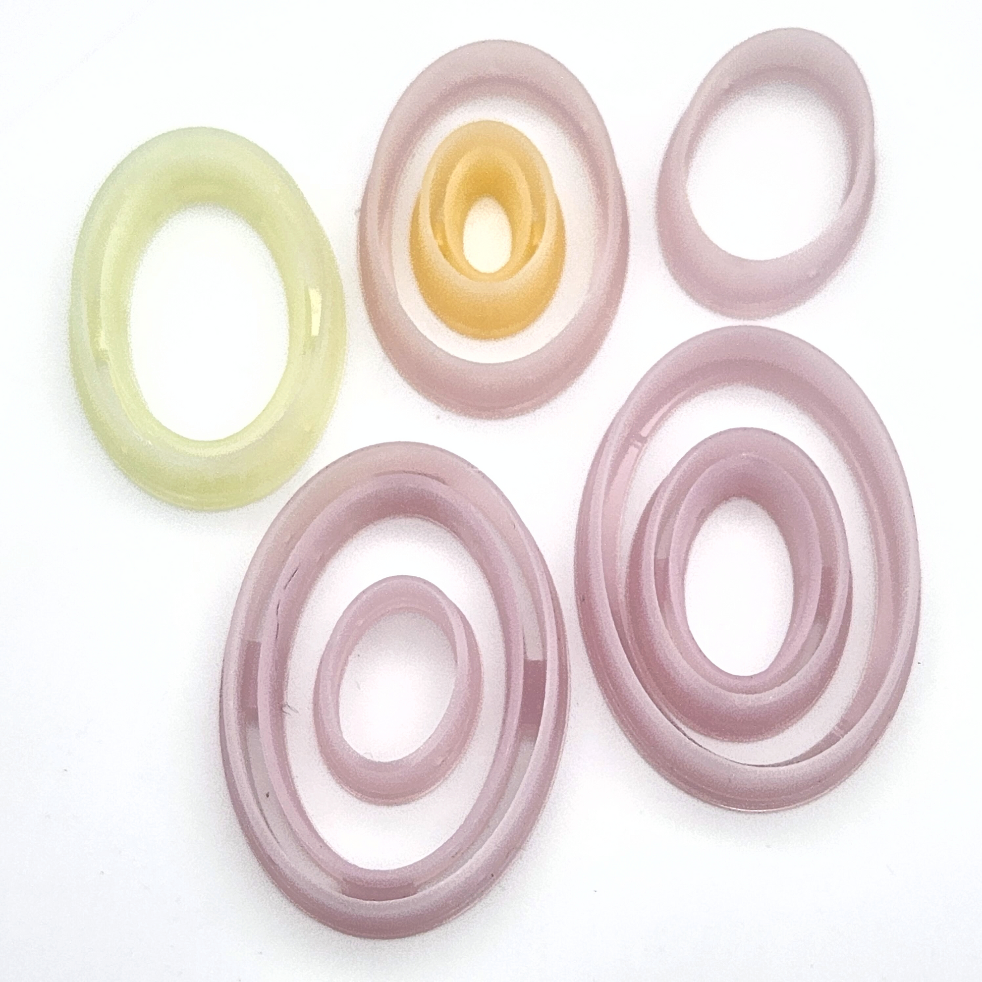 These oval polymer clay cutters are available in four sizes, 2 cm to 5 cm. They are also available in two styles, Outline Cutter and Debossing Frame Cutter