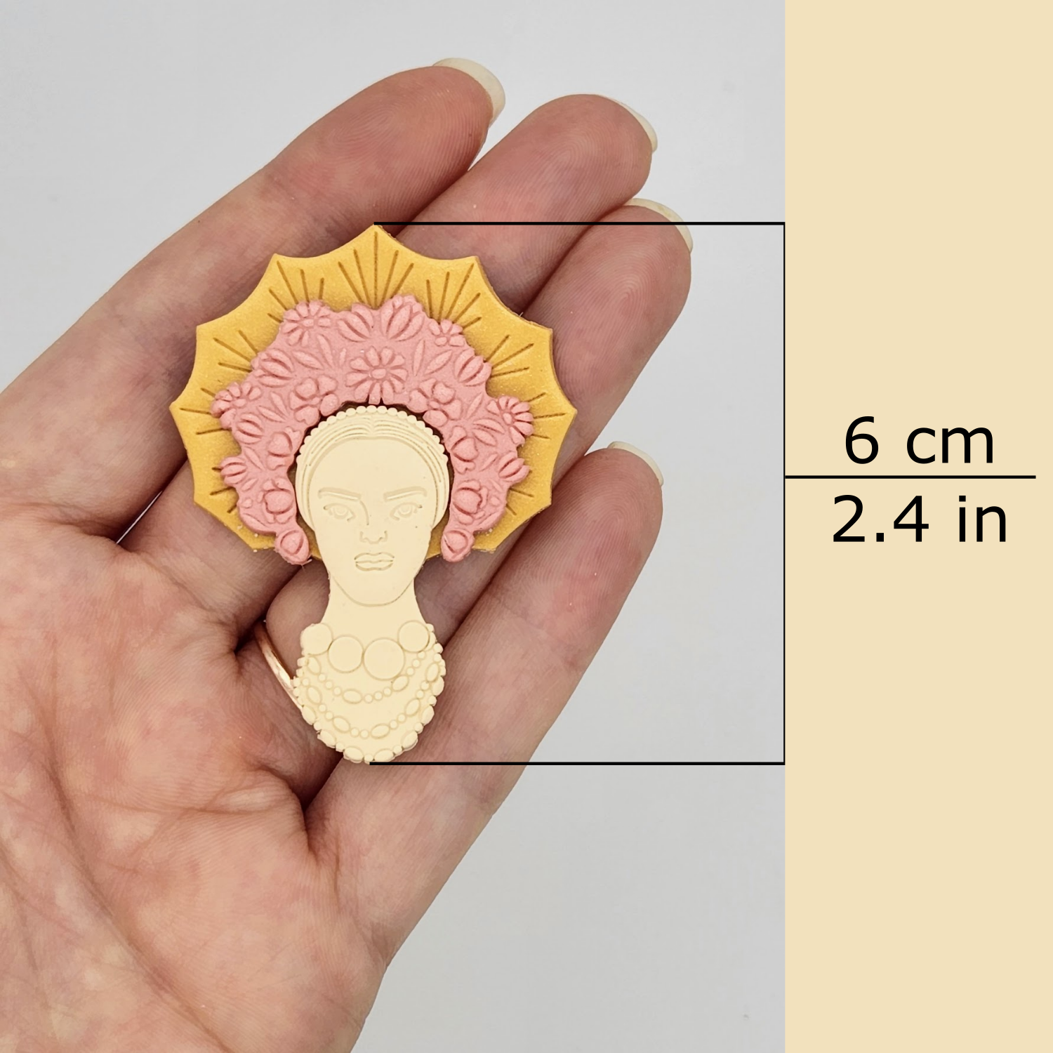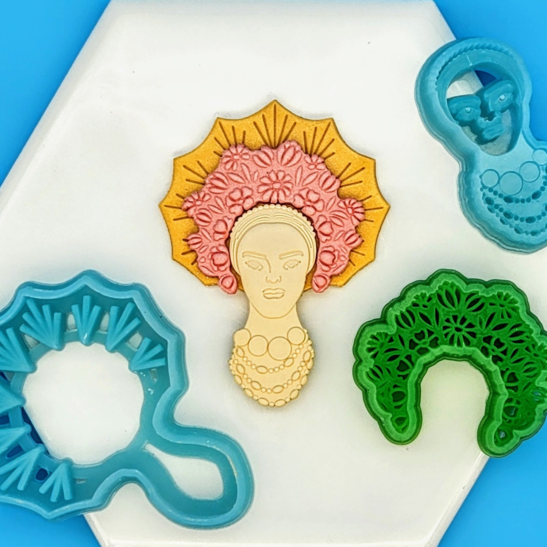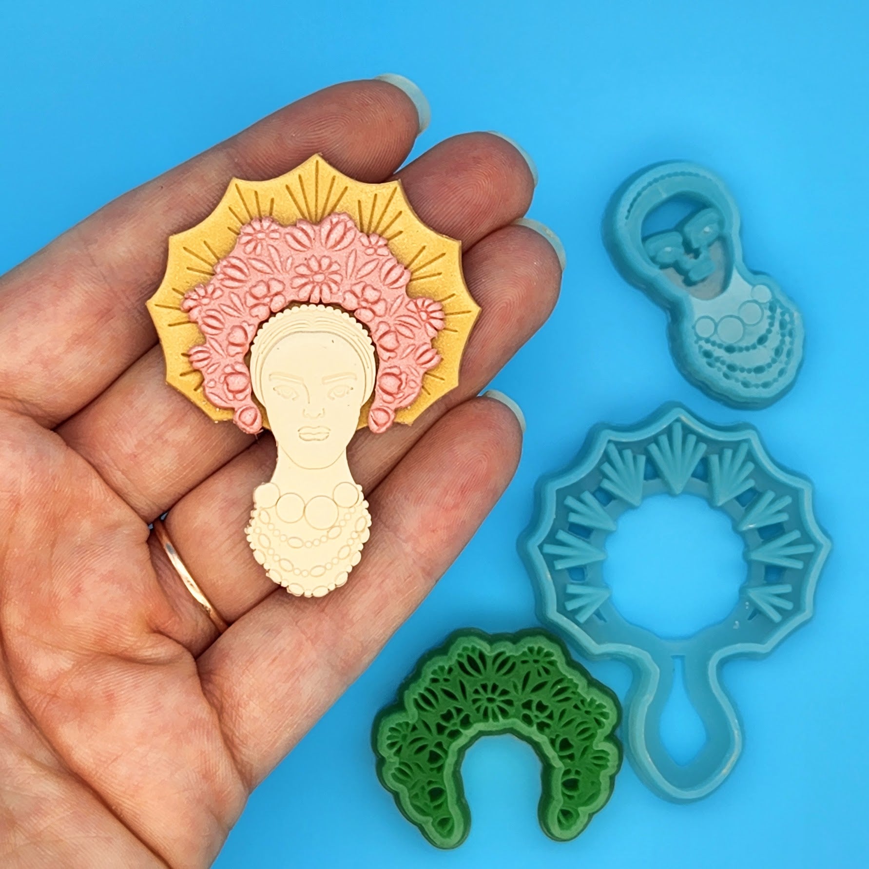 This cutter set includes three debossing polymer clay cutters: a large crown piece, the flowers, and the girl. When fully assembled, the overall piece measures approximately 6 cm (2.4 in) tall and 4.5 cm (1.8 in) wide.