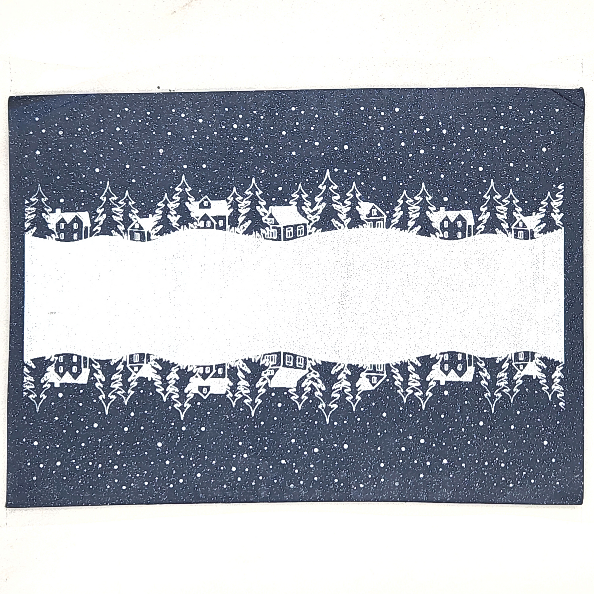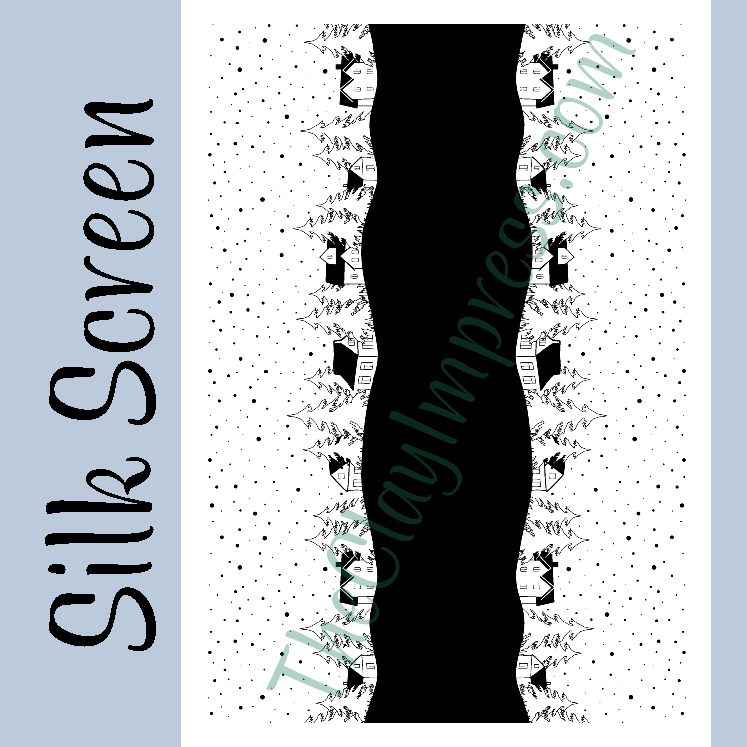 This mirrored Winter cottages silk screen can be used on polymer clay with heavy body acrylic paint, mica powders, or fine chalk pastels.